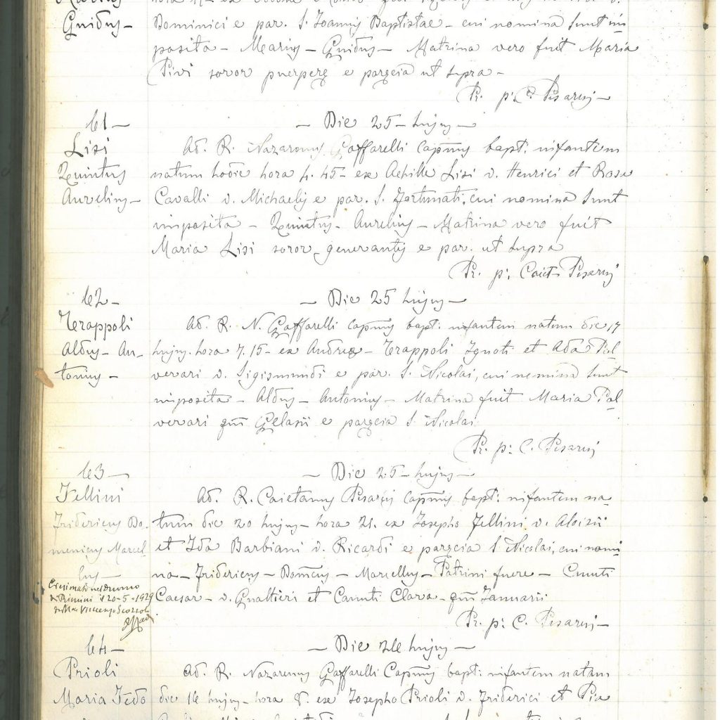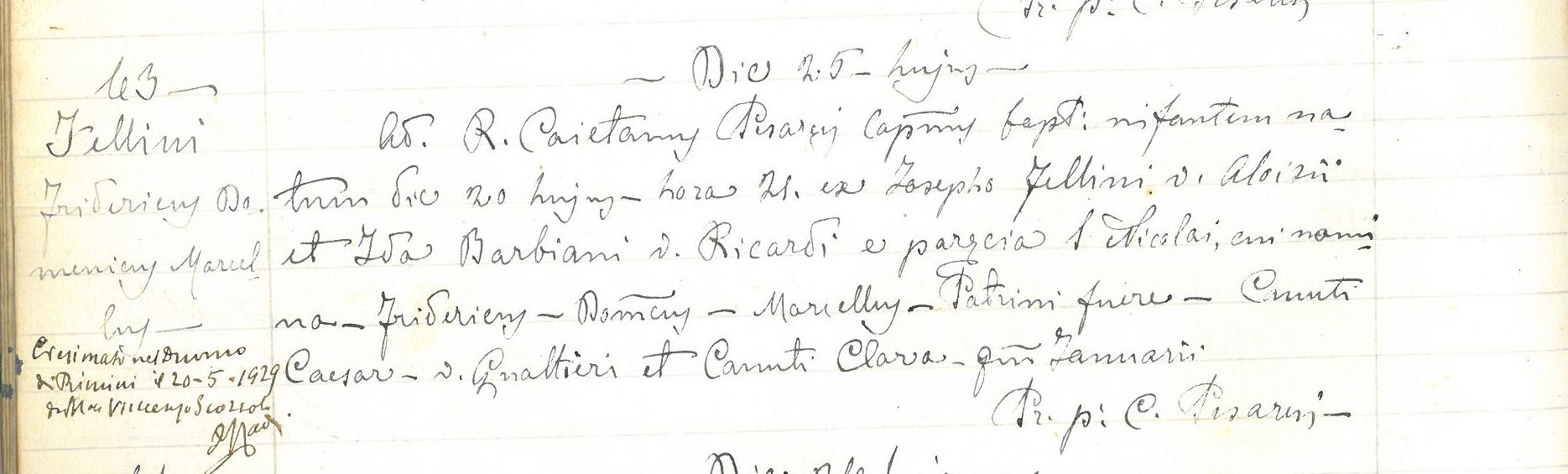 Federico Fellini, figlio di Ida Barbiani e di Urbano, è nato il 20 gennaio 1920 alle ore 21 ed è stato battezzato nella chiesa di San Nicolò il 25 gennaio con i nomi di Federico, Domenico, Marcello. I padrini furono Canuti Cesare e Clara. Dal documento, ricavato dal Registro dei Battesimi, grazie alla collaborazione della signora Federica Giovannini dell’Archivio Storico Diocesano di Rimini alla quale ci siamo rivolti in quanto l’archivio di San Nicolò è andato completamente distrutto da un incendio e riparte solo dal 1930, si nota che il padre di Federico è indicato col nome di Giuseppe anziché Urbano. Sempre dall’estratto del registro dei battesimi leggiamo l’annotazione che Federico fu cresimato nel Duomo di Rimini il 20 maggio 1929 dall’arcivescovo Vincenzo Scozzoli.