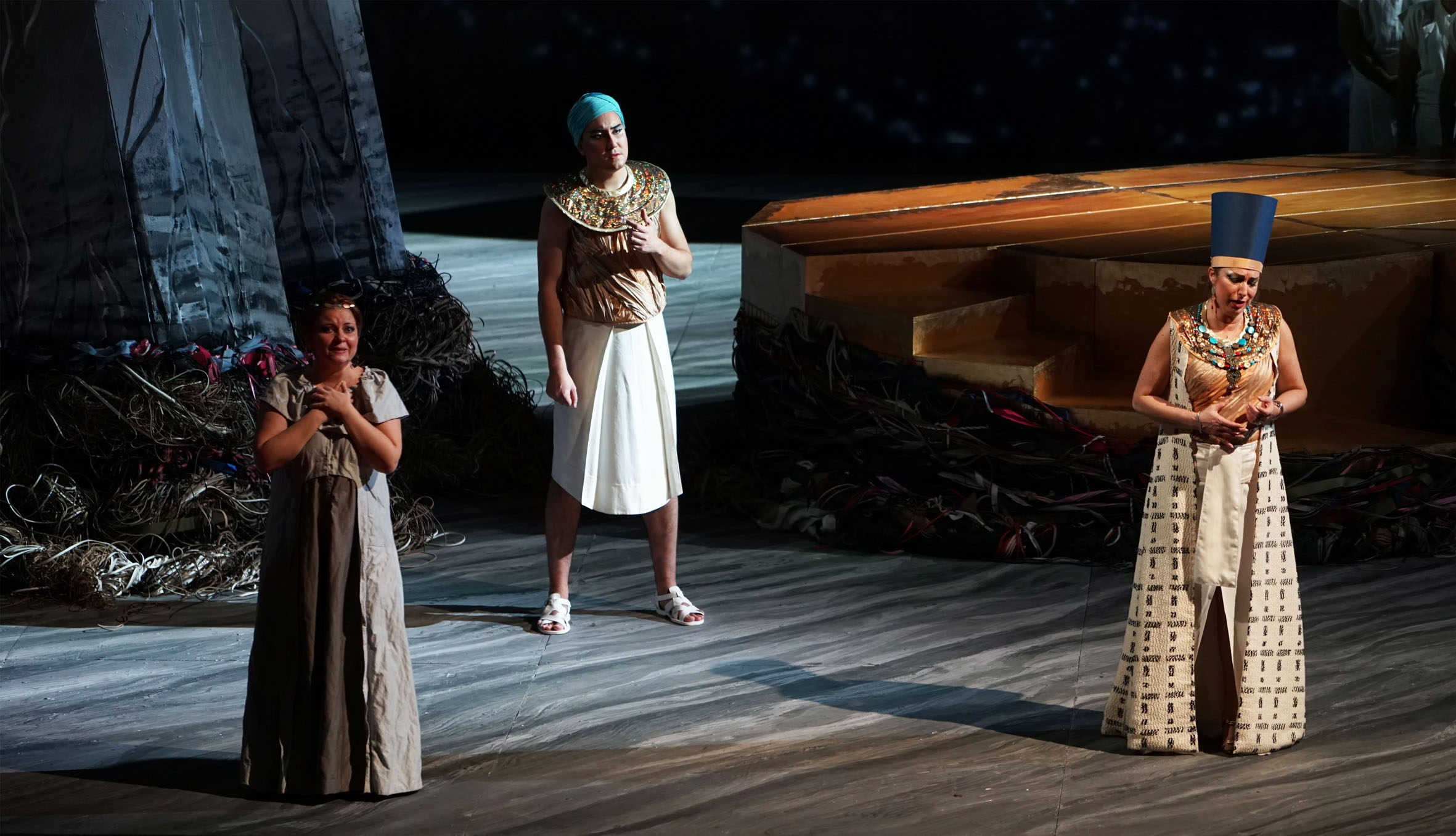 A cominciare dalla protagonista femminile, il mezzosoprano moldavo Natalia Gavrilan, che ha affrontato con sicurezza le difficili escursioni di altimetria della scrittura di Elcia (ruolo concepito per Isabella Colbran), riuscendo a trasmettere le lacerazioni – lei ebrea, andata sposa al figlio del faraone – fra i sentimenti amorosi e i doveri legati all’appartenenza etnica e religiosa, che ne fanno un personaggio quasi anticipatore di certe eroine verdiane. Federico Sacchi è riuscito a delineare Mosè attraverso una sicura linea di canto: peccato che la mancanza di rotondità vocale gli abbia impedito d’imprimere al protagonista l’autorevolezza necessaria a una figura di patriarca. Grande impegno ha profuso Rossini nella definizione di Amaltea, moglie del faraone: ruolo affidato a Silvia Dalla Benetta, che ha saputo mettere a frutto la propria estensione vocale, pur con i limiti di una certa genericità. Ruzil Gatin, impegnato nell’ardua scrittura di Osiride, ha sfoderando apprezzabili mezzi, discostandosi dal cliché del tenore contraltino. Un convincente Faraone, sicuro e preciso, il basso Alessandro Abis. Fra i personaggi minori, il tenore Matteo Roma ha mostrato un’apprezzabile presenza vocale nella parte di Aronne, mentre l’altro tenore, Marco Mustaro è riuscito a caratterizzare con efficacia il personaggio negativo di Mambre. Incisivo il piccolo intervento del mezzosoprano Ilaria Ribezzi, nel ruolo di Amenofi.