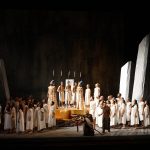 Un nuovo allestimento è appena andato in scena al Teatro Verdi di Pisa: una sorta di seconda inaugurazione, dopo l’insolito The Beggar’s Opera del mese scorso. L’allestimento, inoltre, offriva un’interessante rarità: scene e costumi di José Yaque (insieme a Valentina Bressan). L’artista cubano ha concepito quattro totem sbilenchi, il cui basamento era costituito da materiali di riciclo: un effetto molto suggestivo che sembra evocare la decomposizione della materia e la massiccia invadenza della plastica. L’attraversamento del Mar Rosso, sempre così problematico da rendere sulla scena, è stato risolto in modo efficace, grazie a una specie di rete (in cui sono impigliati materiali di varia natura, non certo pesci) che prima si abbassa per permettere il passaggio degli Ebrei, poi si solleva intrappolando gli Egizi, quasi a lanciare un grido d’allarme per quella che è l’attuale condizione dei nostri mari.