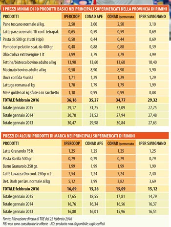 A gennaio 2016 il Comune di Rimini registra una lieve crescita dei prezzi (+0,1%) rispetto a un anno fa. Findomestic parla di acquisti in ripresa (+8,9% nel riminese) mentre l’indagine del mensile TRE rileva aumenti in tutti i supermercati analizzati, ad eccezione dell’Iper di Savignano