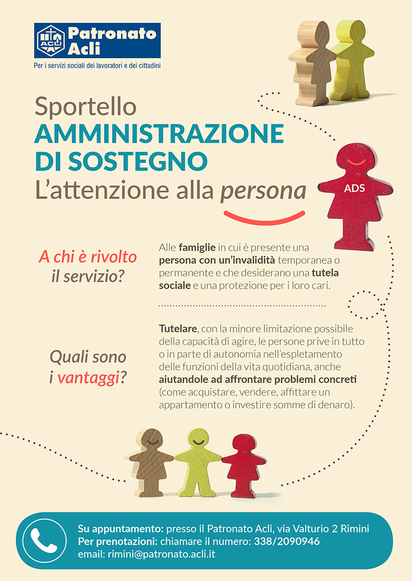 Nasce un nuovo sportello “Amministrazioni di sostegno”, grazie all’alleanza tra Lega Consumatori e Patronato Acli di Rimini. Si tratta di uno sportello finalizzato a fornire informazioni, consulenza e assistenza a tutti coloro che avessero necessità in famiglia della figura dell’amministratore di sostegno / tutore / curatore.