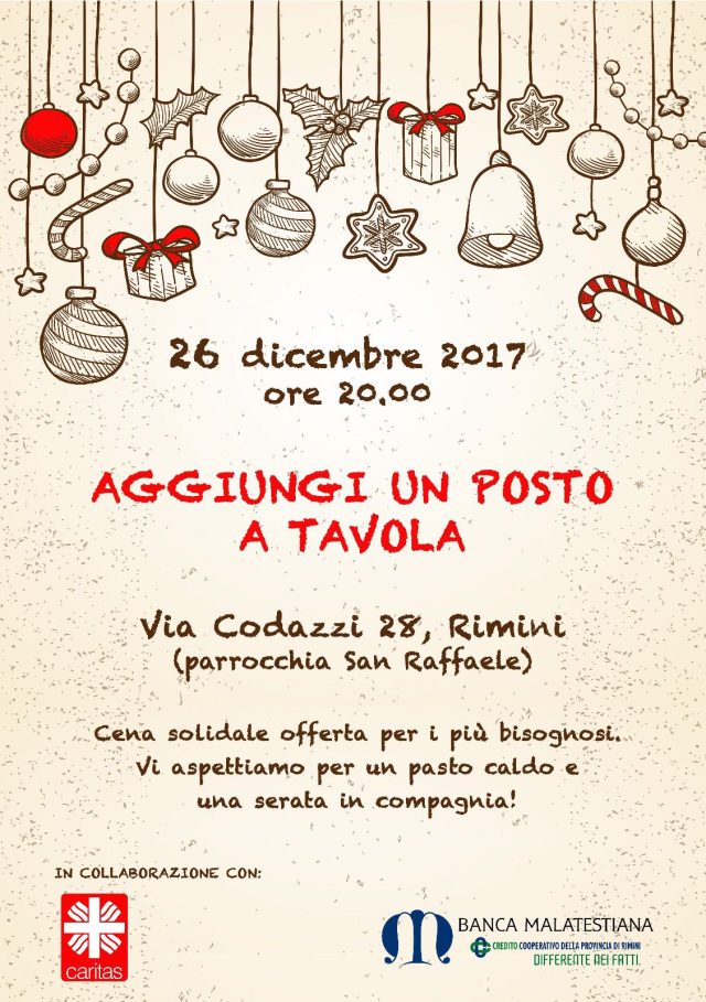 stiamo organizzando una cena solidale autogestita per i più bisognosi della zona (con appoggio di Caritas e Banca Malatestiana) che si terrà il 26 sera. Si prevedono circa 100/150 persone e stiamo cercando di raccogliere più alimenti possibili per poter offrire un pasto caldo a tutti quelli che si presenteranno.