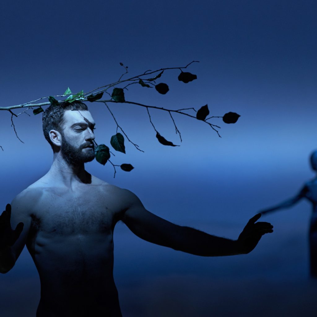 In mezzo al palco completamente vuoto, con una rasserenante luce azzurra a fare da sfondo, sta un Adamo nudo, dall’aspetto statuario e dai gesti ieratici (il danzatore Michalis Theophanous). Avanza con passo lentissimo, mentre l’orchestra esegue il primo brano Sequentia, l’unico scritto ex novo da Pärt. Tra le mani l’uomo tiene qualcosa che assomiglia a un cervello e, mentre si avvia a cogliere un ramo simbolo dell’albero della conoscenza, lo lascia cadere in terra. È cominciato l’allontanamento dall’Eden con tutte le conseguenze che scandiranno il percorso del genere umano. La musica intanto prosegue con i tre brani successivi: Il lamento di Adamo, Tabula rasa, Miserere. Il primo, scritto per coro su testo russo, denso di echi della liturgia ortodossa, si trasforma anche in occasione per apprezzare la bravura dei coristi del Teatro dell’Opera, ben preparati da Ciro Visco; il secondo, del 1977, che vede impegnati i due bravissimi solisti di violino Vincenzo Bolognese e Francesco Malatesta, rappresenta un punto di svolta nell’arco creativo di Pärt; l’ultimo, e più imponente, denso di rimandi liturgici, implica il contributo di cinque cantanti solisti. Per valorizzare il millimetrico rigore con cui è costruita una musica facile, ma solo all’apparenza, sul podio è salito il direttore estone Tõnu Kaljuste, autentico specialista di Pärt e del suo inconfondibile stile “tintinnabuli”.