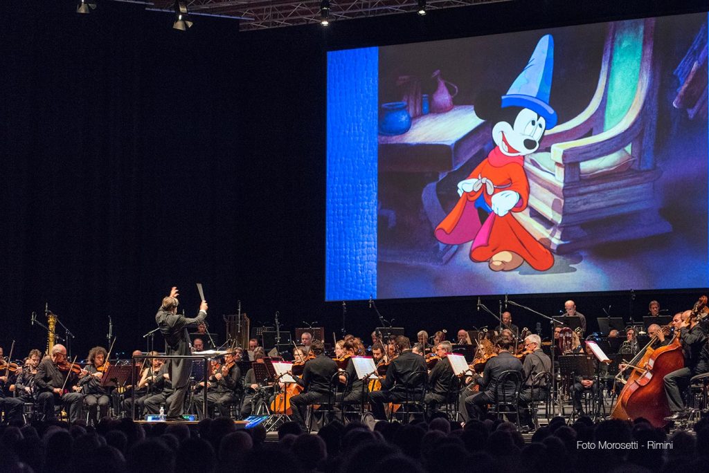 RIMINI, 8, 11, 15 settembre 2017 – Inutile nasconderselo: la vocazione di Rimini è quella di una città legata al cinema. E la sessantottesima edizione della Sagra Musicale Malatestiana non ha fatto altro che confermarlo, richiamando un pubblico numerosissimo per l’ultimo appuntamento concertistico all’Auditorium del Palacongressi, dove era in programma Fantasia, il capolavoro di Walt Disney del 1940 (e riedito nel 2000), accompagnato dall’esecuzione di musiche dal vivo. Come base sonora di immagini appartenenti sia alla prima che alla seconda versione, celeberrime pagine musicali: da Beethoven a Čajkovskij, da Debussy a Stravinskij e Respighi, passando per Ponchielli e Dukas. L’impresa di armonizzare video e suoni, molto più impegnativa di quanto si possa pensare, era affidata all’Orchestra del Teatro Comunale di Bologna. Costretto all’uso delle cuffie per garantire il sincronismo tra la musica e le animazioni, il direttore Christopher Franklin ha guidato gli strumentisti bolognesi con gesto nitido e rigore metronomico, anche se questa precisione non è sempre apparsa sufficiente a scongiurare qualche irregolarità ritmica dell’orchestra: per fortuna le immagini, con la loro suggestiva potenza, hanno catalizzato tutta l’attenzione del pubblico e dei numerosi bambini presenti.