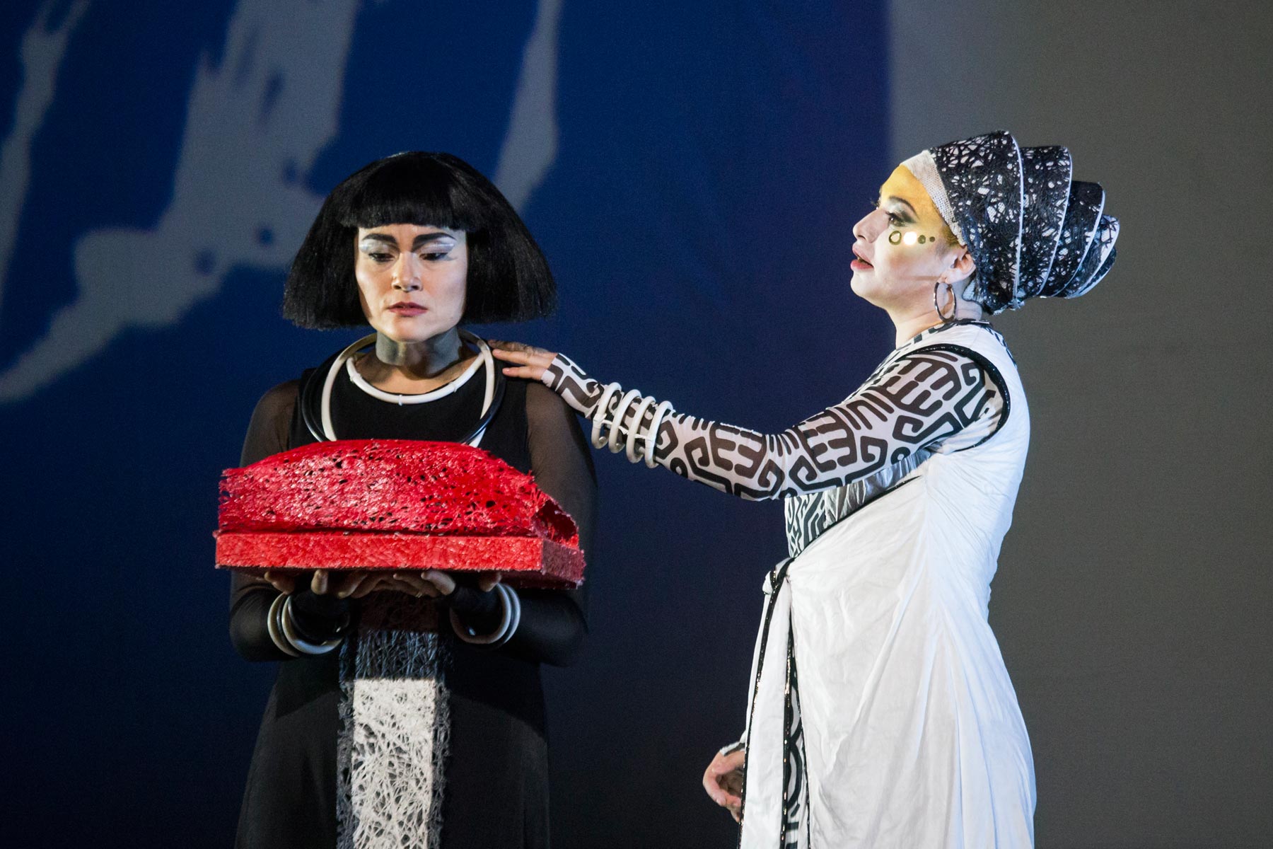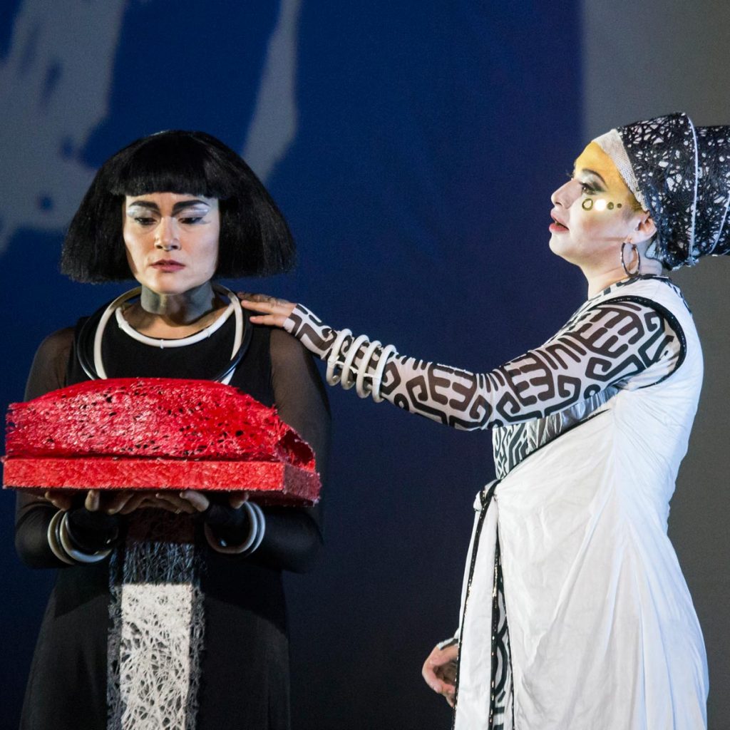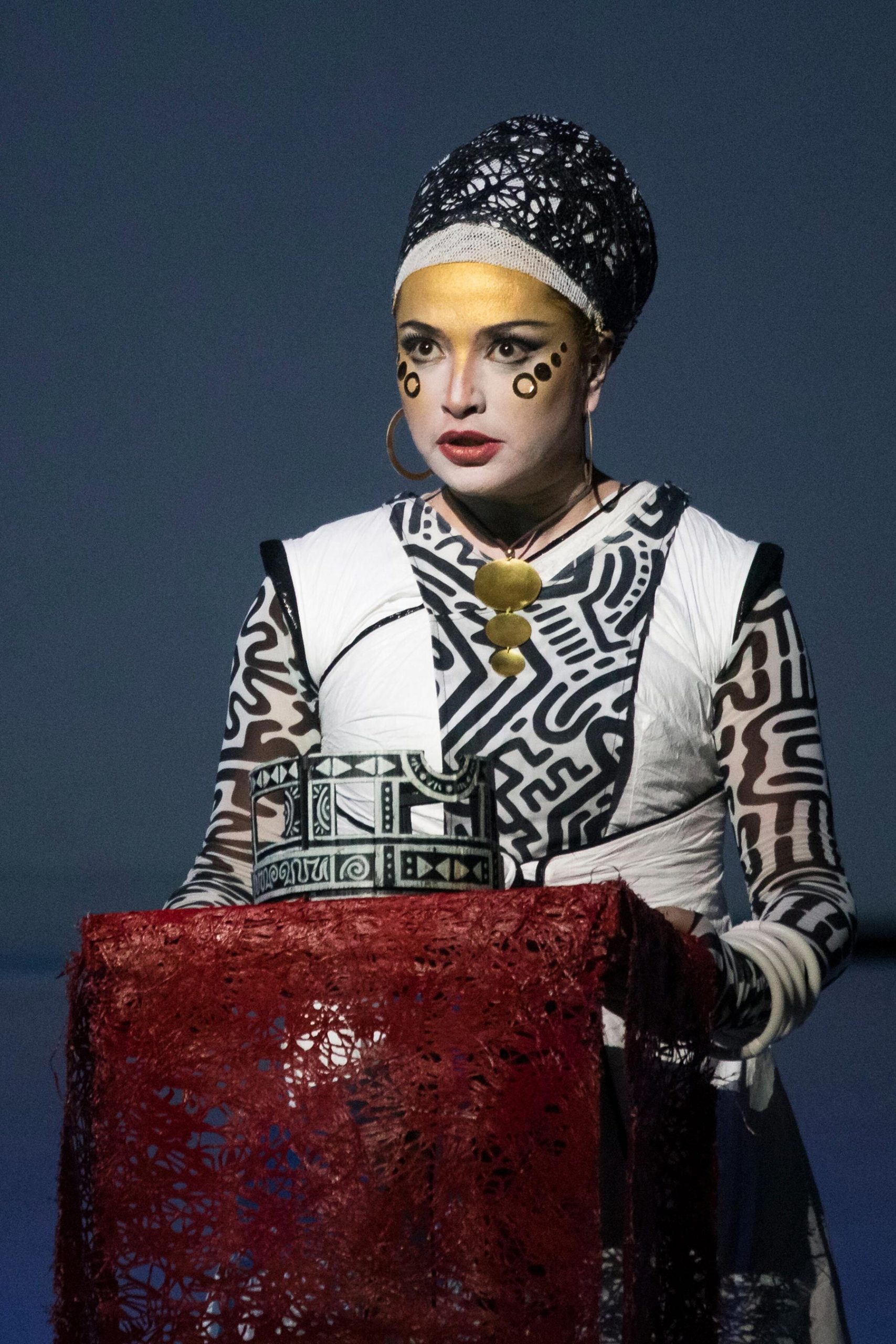 BOLOGNA, 21 novembre 2017 – Nell’Aida 2.0 non ci sono elefanti né portantine o schiavi che agitano flabelli. Nessun eccesso, ma tutto all’insegna del più rigoroso minimalismo. L’impianto scenico concepito da Edoardo Sanchi appare come un grande computer portatile aperto, che occupa l’intero spazio: al suo interno si muovono i personaggi, piccoli e sperduti, in modo da trasmettere una sensazione di solitudine e difficoltà a comunicare. Invece, la parte che funge da schermo – forse una versione aggiornata delle tavolette degli scriba – viene sottoposta a continue variazioni cromatiche, scandite dai disegni stilizzati e dalle scritte di Francesca Ballarini: una sorta di parole-chiave, con qualche didascalismo di troppo, per puntualizzare un particolare momento drammaturgico. La sensazione è quella di un Egitto mentale, reso ancor più suggestivo dagli affascinanti costumi di Silvia Aymonino, che risaltano nella spoglia cornice. Così come il balletto, affidato alla compagnia di ballo Artemis Danza, con l’atletica coreografia di Monica Casadei, ben valorizzata dal contesto scenico. A lasciare perplessi, invece, è la somiglianza di Aida con una certa iconografia di Nefertiti (ma la protagonista dell’opera non è una principessa etiope?), forse più adatta alla rivale Amneris: lei sì, figlia di faraone.