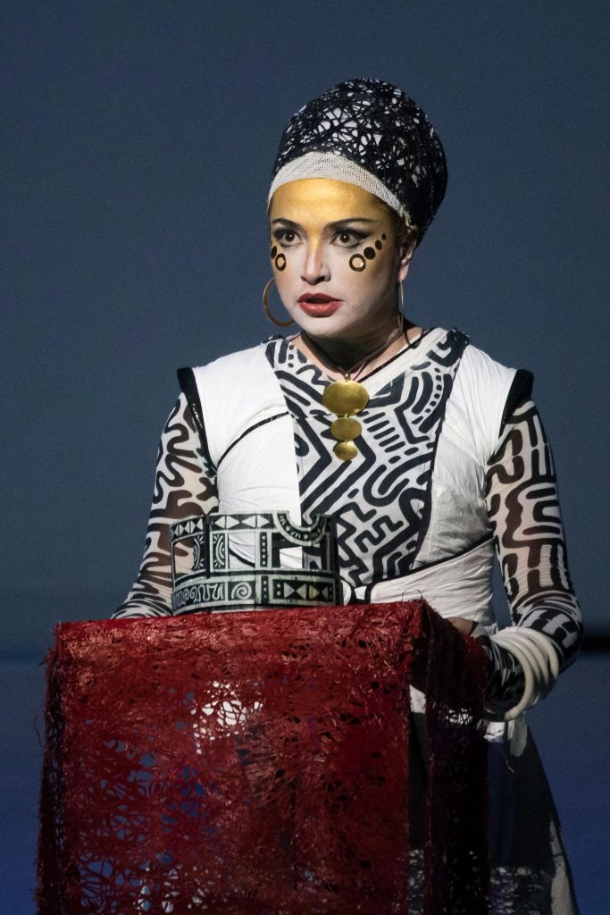 Lo spettacolo del Comunale di Bologna – penultimo titolo della stagione 2017 – nato per lo Sferisterio di Macerata, con la regia di Francesco Micheli, punta sulla sottrazione: sicuramente un aspetto positivo, tenuto conto che Aida è forse il titolo verdiano su cui i registi si sono avventurati con il maggior accanimento, quasi sempre procedendo per accumulo. Concepita per celebrare un prodigio della tecnica come l’apertura del canale di Suez, nel 1869, e andata in scena oltre un anno dopo, questa Aida contemporanea – per mantenere un’eco della fascinazione tecnologica – si affida all’oggetto forse più iconico di oggi: il tablet, utilizzato di frequente dai personaggi. Del resto, anche gran parte del pubblico usa, e con notevole soddisfazione, il proprio smatrphone per leggere i versi del libretto di Ghislanzoni: e meno male che i caratteri sono bianchi su sfondo nero così il fastidio legato all’impatto luminoso è minimo.