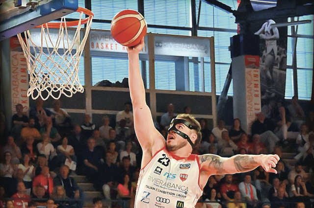 Lasciamo i ricordi (amari) nel cassetto e specchiamoci nella straordinaria stagione della Rinascita Basket Rimini: 56 punti, frutto di 26 vittorie, a fronte di 12 sconfitte, e testa di serie numero 1 nei playoff che partono domenica 11 maggio al Flaminio ( il mascherato Johnson nella foto Alfio Sgroi).