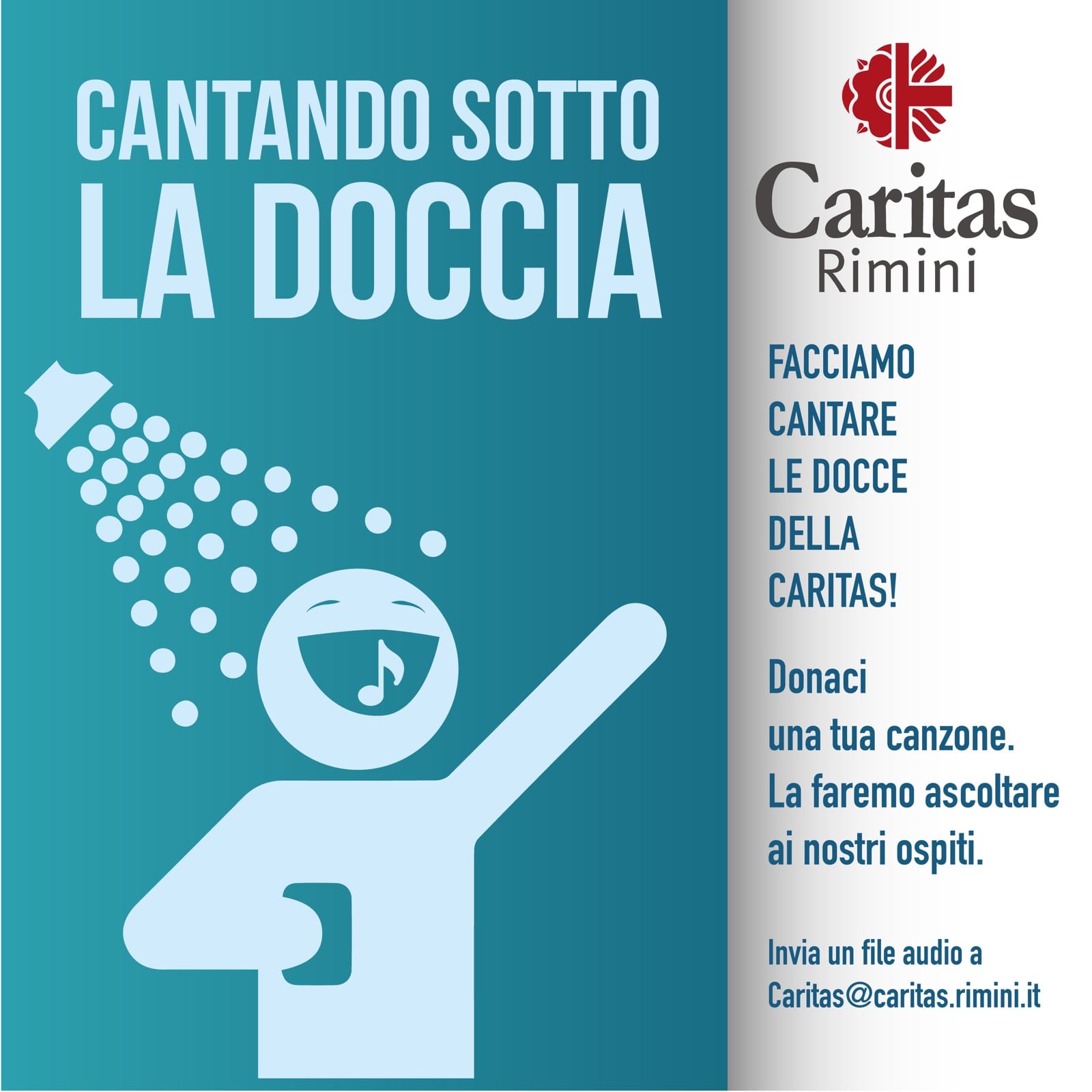 Le richieste che arrivano in Caritas sono molteplici e tra queste c’è anche il bisogno di usufruire di una doccia e di igiene personale. Si può offrire questo servizio in silenzio oppure chiamare a raccolta cantautori e musicisti a tenere compagnia alle persone in un momento intimo. L’idea della Caritas è: “Cantando sotto la doccia!”. “Facciamo cantare le docce della Caritas! Donaci una tua canzone. La faremo ascoltare. La faremo ascoltare ai nostri ospiti”.