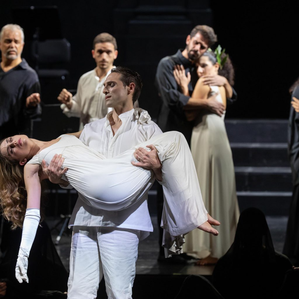 RAVENNA, 6 novembre 2021 – Una parete che potrebbe appartenere a una dimora nobiliare oppure a un cimitero monumentale – e, perché no?, essere anche la facciata di un teatro – rappresenta il fondale dell’intera scena. Gli interpreti discendono lungo gli scalini del portone centrale, l’orchestra è sul palco, mentre la buca viene utilizzata per raffigurare gli inferi, e un praticabile – verso la platea – consente ai cantanti di aumentare lo spazio a disposizione.