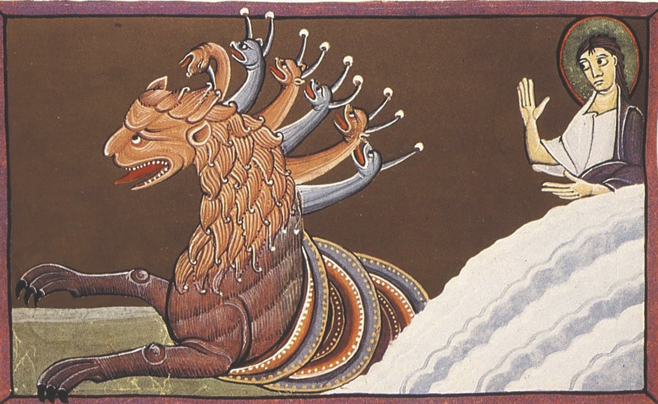 Il segno del drago rosso (Ap 12,3) si colloca nella sfera della trascendenza, perché accade nel cielo. Il rosso fa riferimento all’ambito demoniaco e infernale. La bestia ha sette teste, numero che indica la totalità. Dal momento che la testa è la radice della vitalità e dell’animazione, allora potremmo dire quasi che esprime la totalità massima di energia distruttiva, come tutto l’arsenale nucleare delle potenze umane. Secondo la felice espressione dell’esegeta U. Vanni, la bestia, pur provenendo dalla sfera trascendente, indica il “sistema terrestre”, pronto a contrapporsi violentemente al “sistema di Cristo”. Ci si chiede come le dieci corna siano poi distribuite sulle sette teste.
