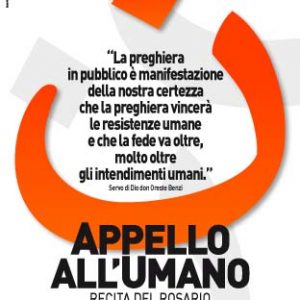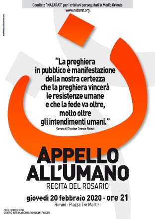 Quell’Appello all’umano partito da Rimini è da anni che raggiunge tutta l’Italia e si dipana anche oltre i confini del BelPaese. E puntuale fa sentire la sua voce, che si distende in preghiera. Giovedì 20 febbraio, alle ore 21, piazza Tre Martiri ospita il prossimo appuntamento dell’Appello all’umano, la preghiera del rosario per ricordare le violenze e le persecuzioni dei cristiani in tutto il mondo. Prosegue dunque la tradizione della preghiera in piazza, come ogni 20 del mese avviene a Rimini e in altre città italiane e straniere (sul sito www.nazarat.org si può trovare il programma dettagliato di ogni singola iniziativa).