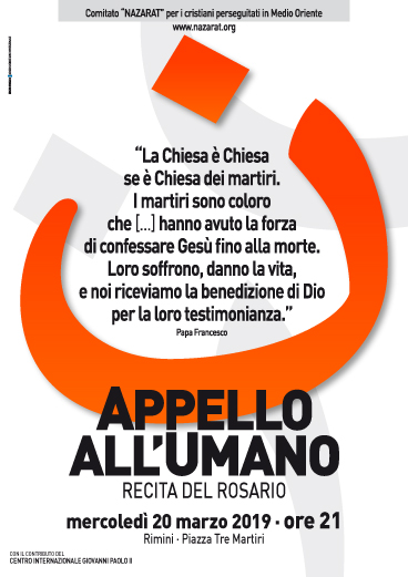 Appello all’umano, la preghiera torna in piazza a Rimini. Sostenuto questo mese da una frase di Papa Francesco: “La Chiesa è Chiesa se è Chiesa dei martiri. I martiri sono coloro che (…) hanno avuto la forza di confessare Gesù fino alla morte. Loro soffrono, danno la vita, e noi riceviamo la benedizione di Dio per la loro testimonianza”, con l’appuntamento del 20 marzo siamo arrivati all’Appello all’umano numero 56: sono in fatti 56 gli appuntamenti di preghiera e sostegno alla testimonianza dei cristiani perseguitati nel mondo proposti dal comitato Nazarat il 20 di ogni mese a partire dall’agosto 2014. Anche mercoledì alle ore 21 in piazza Tre Martiri verrà recitato il rosario per raccogliere l’invito alla preghiera di cui s’è fatto promotore più volte lo stesso papa Francesco. Abbiamo utilizzato un suo discorso per stampare il manifesto di convocazione: “La chiesa è chiesa se è chiesa dei martiri. I martiri sono coloro che hanno avuto la forza di confessare Gesù fino alla morte. Loro soffrono, danno la vita e noi riceviamo la benedizione di Dio per la loro testimonianza”. Da qualche tempo a questa parte l’intenzione di preghiera, che inizialmente è stata rivolta per la maggior parte ai cristiani del Medio Oriente, ha allargato l’orizzonte ai cristiani della Nigeria, dell’India e del Pakistan che patiscono persecuzioni spesso nel completo silenzio di tanti mass media.