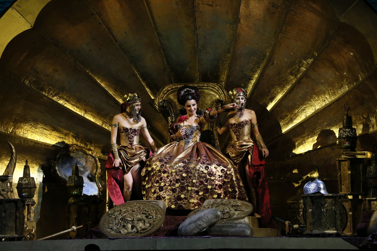 Lo spettacolo visto al Malibran di Venezia proveniva dal Festival della Valle d’Itria, dove ha debuttato la scorsa estate, con la regia di Fabio Ceresa, che mescola elementi comici a trovate ironiche (dalla spiritosa liberazione di Bradamante dai suoi abiti maschili, nel tentativo di recuperare la propria identità femminile, agli sforzi per rendere più sottile e, dunque seduttivo, il giro-vita di Alcina) funzionali a una certa giocosità musicale. Massimo Checchetto ha realizzato una scena che riesce a focalizzare gli snodi cruciali della vicenda, a cominciare dal divertente ippogrifo azionato da due mimi (appartenenti al collettivo Fattoria Vittadini, figuranti anche in numerose scene), mentre i costumi di Giuseppe Palella rappresentavano una sorta di evanescente rivisitazione mentale della sontuosità barocca.