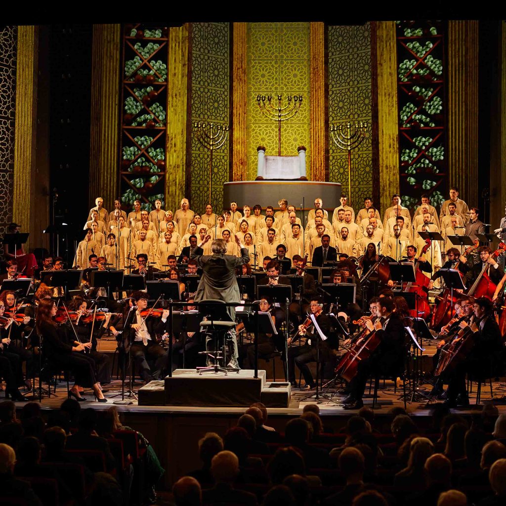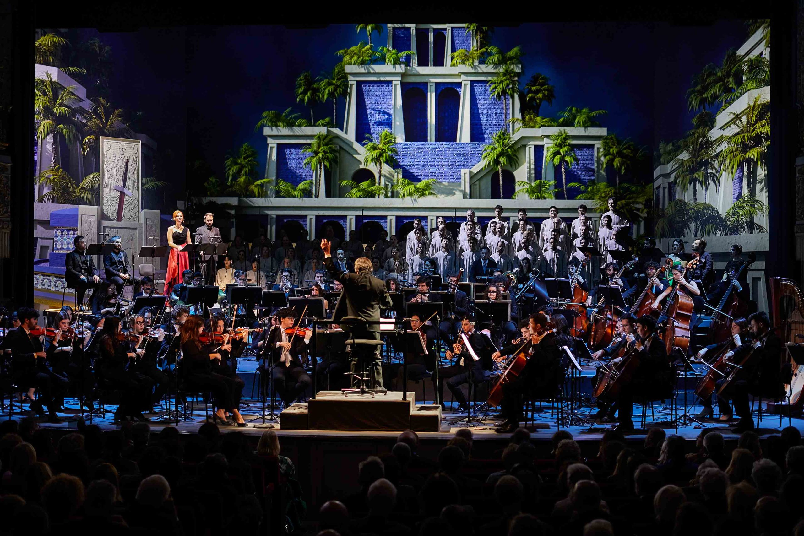 Secondo titolo della Trilogia d’Autunno all’Alighieri di Ravenna, Nabucco ha riproposto la stessa formula collaudata il giorno precedente con Norma: ancora una scenografia virtuale – firmata dal visual artist Svccy, dal visual programmer Davide Broccoli, con il disegno luci di Eva Bruno – dove viene evocato il tempio di Salomone a Gerusalemme e, in seguito, un’immaginaria Babilonia.