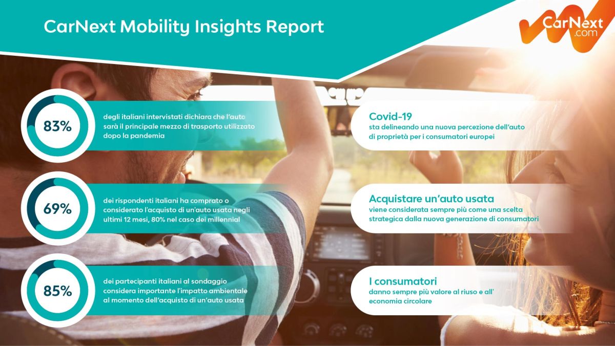 Dalisa Iacovino, Country Manager di CarNext Italia, commentando il rapporto, sottolinea che “Il CarNext Mobility Insights Report rivela molti fattori che influenzano l’evoluzione del mercato dell’auto usata e fotografa il trend che vede i consumatori come appassionati acquirenti di veicoli online. Questo è in parte un riflesso della crescita generale dell’e-commerce, ma è anche la dimostrazione di una maggiore fiducia nell’utilizzo di piattaforme digitali sicure come CarNext. La crescente importanza del ‘riusò tra i consumatori sempre più consapevoli rappresenta per CarNext un’enorme opportunità, in quanto sempre più persone scelgono le auto usate di alta qualità a prezzi accessibili per soddisfare le proprie esigenze di mobilità per il futuro”.