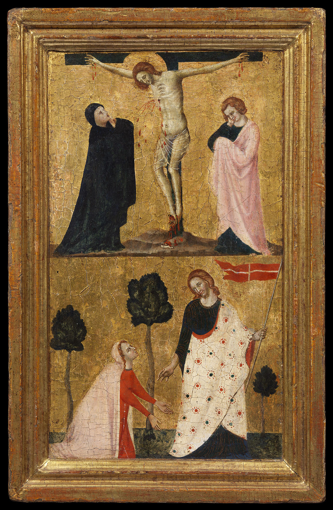 Da qui la seconda chiave interpretativa della Croce: l’axis mundi. Tradizionalmente considerata come fatta del legno dell’Albero della Vita, sorregge il mondo e collega i livelli di esistenza: l’inferiore, quello dei trapassati, il terreno, quello dei viventi, ed il celeste, quello dell’eterna beatitudine e delle realtà superiori. Sempre secondo la tradizione, inoltre, il Golgota si erge sulla tomba di Adamo, il cranio del quale è spesso raffigurato ai piedi della Croce. Nel Crocifisso del “maestro di Verucchio”, però, quello spazio è occupato dalla Maddalena, figura particolarmente cara alla devozione degli Ordini Mendicanti, della quale Giovanardi nota che: <+cors>“… è come conficcata nella terra, per innalzarsi al Cielo”.