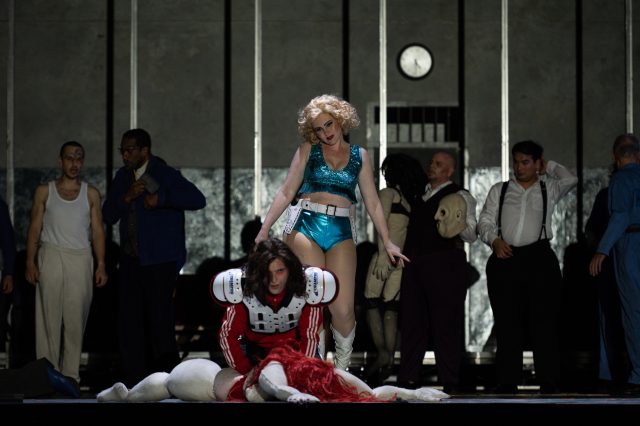 Unica figura di donna l’esuberante ed espressivo mezzosoprano Carolyn Sproule, nelle succinte vesti di una prostituta autorizzata a prestare i suoi servizi ai detenuti, destinata a diventare incarnazione dei fantasmi femminili che popolano il passato dei carcerati. La regia valorizza anche le figure del vecchio prigioniero, interpretato con voce flebile ma penetrante da Colin Judson, e quella del grande detenuto (un’autorità rispettata nella gerarchia del carcere), incarnato da Erin Caves, tenore sovrastante per volume vocale non meno che per stazza. Sarà lui, alla fine, a prendersi cura del giocatore di basket – nel frattempo ridotto in carrozzina – e a infondendogli quel coraggio necessario a sollevarsi e andare di nuovo a canestro. Spiccando il volo al posto dell’aquila.
