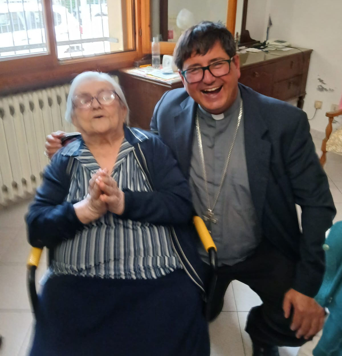 Nata nel 1925 a Talamello e cresciuta a Campiano, Dina (qui festeggiata dal Vescovo Nicolò, che prima degli impegni ecclesiali ha voluto portare il suo affettuoso saluto alla nonna secolare)