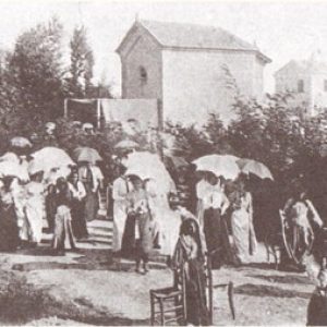 Mi piace riprodurre qui il particolare di una cartolina illustrata raffigurante la gente che, sul mezzogiorno, esce dalla messa (l’ho trovata in un libro del 1979, Romagna e romagnoli, ed. Maggioli, p. 259). Fra le signore con ombrellino si vede bene, in primo piano, una servetta che trasporta due sedie; un po’ più lontano ce n’è un’altra; le sedie sono quelle che avevano portato in chiesa per le loro padrone prima della messa. Non si tratta di una immagine medievale proveniente da chissà quale paese lontano, ma di una fotografia fatta a Bellaria all’inizio del Novecento.