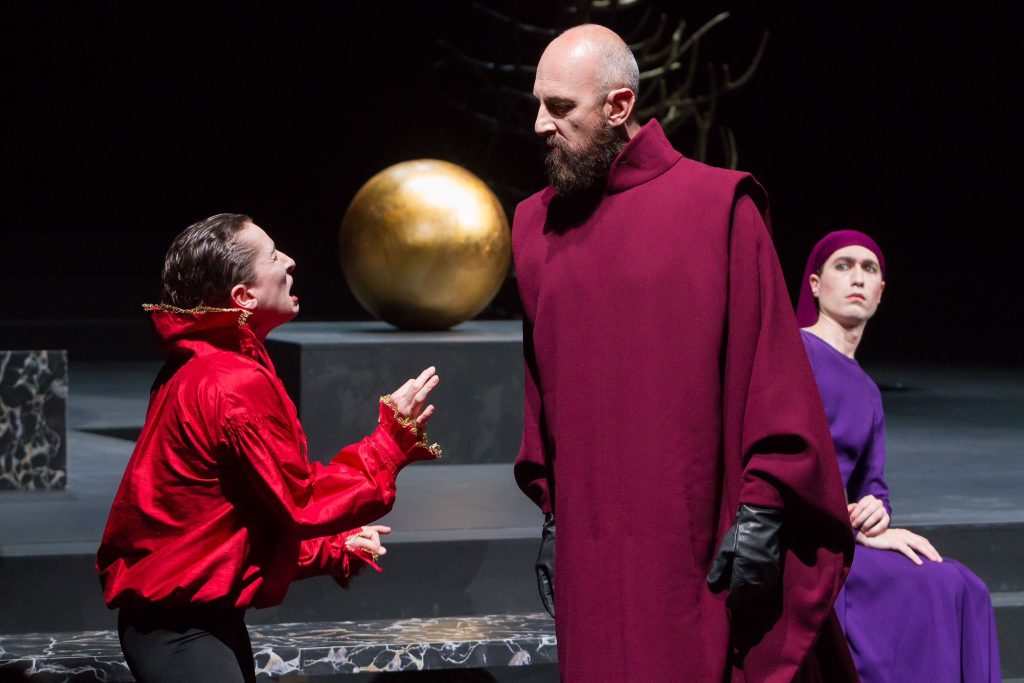 Bisogna dare atto a Pizzi che, alle soglie dei novantaquattro anni (li compirà a giugno), riesce ancora a sorprendere. Se in tempi di abbondanza il repertorio barocco gli ispirava sontuose scenografie, ora disegna spazi quasi metafisici, altamente evocativi e affidati a pochissimi elementi. La scena fissa – spoglia e sobria – prevede due coppie di colonne su entrambi i lati del palcoscenico, per mettere a confronto mondi diversi: specchio dell’estrazione sociale dei personaggi. Al centro, un albero rinsecchito e un globo dorato (un pomo?), che forse è l’unico frutto di quella stessa pianta ormai prosciugata. Visivamente non si corre mai il rischio della staticità. A scongiurarla è il fluttuare delle vesti dei personaggi: le splendide tuniche femminili o i morbidi mantelli maschili, che non si limitano ad avvolgere i corpi, ma imprimono movimento e, nello stesso tempo, arricchiscono lo spettacolo di suggestive gamme cromatiche.