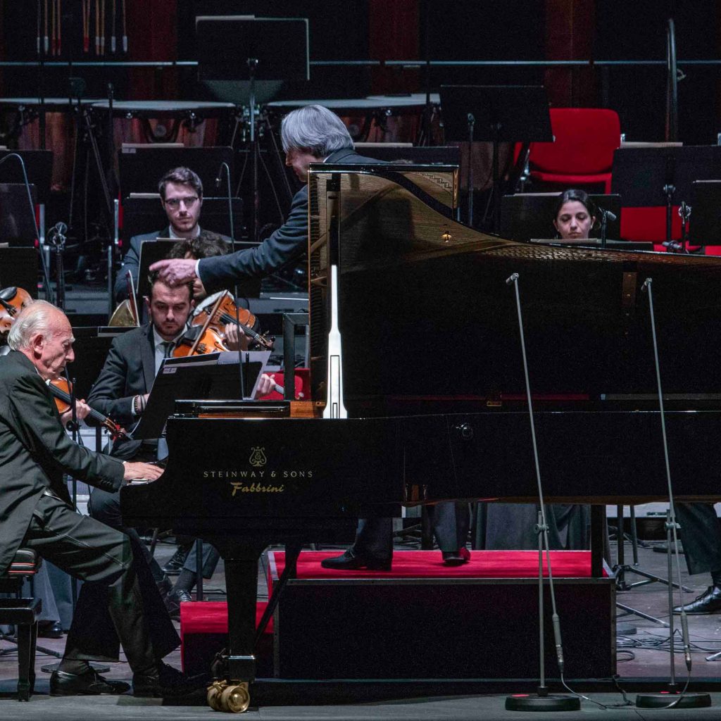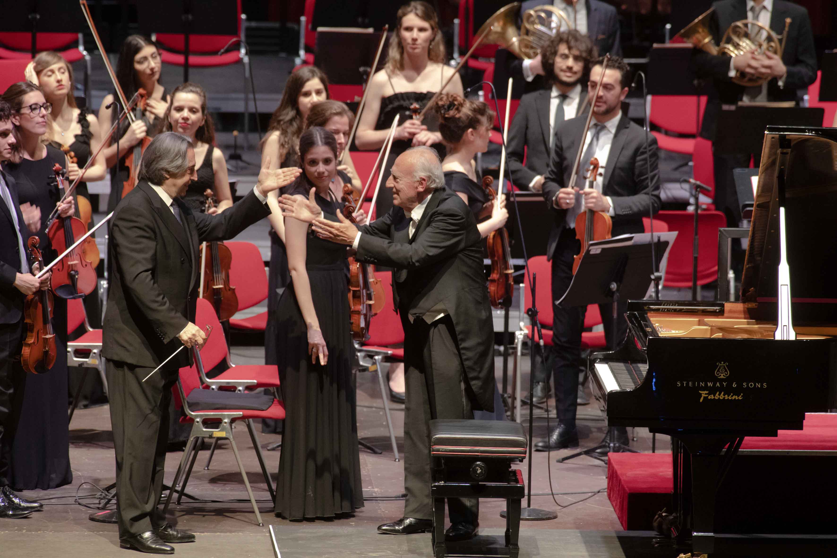 RAVENNA, 5 giugno 2019 – Un confronto ravvicinato fra due giganti, sul terreno di Mozart. Il pianista Maurizio Pollini è stato lo straordinario ospite nella serata inaugurale del trentesimo Ravenna Festival, impegnato come solista insieme all’Orchestra Giovanile Luigi Cherubini diretta da Riccardo Muti.