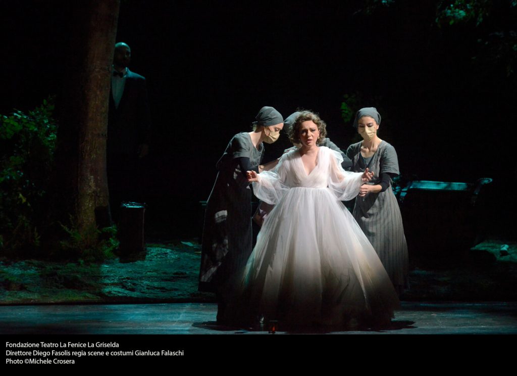L’opera, nata per Venezia, è stata proposta in un nuovo allestimento affidato a Gianluca Falaschi al Teatro Malibran, nell’ambito di una ricognizione vivaldiana avviata da qualche anno nelle programmazioni liriche della Fenice. Il regista, che firma anche scene e abiti (Falaschi è nato come costumista), sposta l’azione in una modernità senza tempo: non c’è la reggia indicata dal libretto e la protagonista – per evidenziarne le umili origini – lavora in un laboratorio di sartoria, dove è considerato del tutto naturale vessare le donne. All’inizio del secondo atto, invece, la parete di fondo si solleva, lasciando posto alla foresta in cui viene ricacciata Griselda: un luogo soprattutto metaforico, che consente di far percepire con maggior intensità la solitudine e i sentimenti della protagonista.