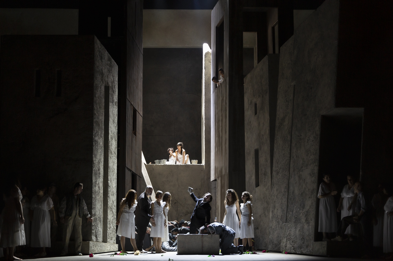 E dire che Les vêpres siciliennes non è certo un titolo fra i più facili, né di presa immediata: primo vero esperimento verdiano di grand-opéra (fu scritta per Parigi nel 1855), arriva subito dopo la ‘trilogia popolare’, presentando un andamento insolito nello sviluppo dei personaggi. Eppure è proprio questo suo carattere anomalo ad affascinare sopra ogni altra cosa. Gatti è stato molto vigile nel sottolinearlo, attraverso una cura minuziosa dei dettagli sonori, e sempre benissimo assecondato dall’orchestra del Teatro dell’Opera, che raramente si è ascoltata a tali livelli di eccellenza: basterebbe pensare alla sinfonia, anatomizzata nei suoi infiniti dettagli, e – forse ancor più – al distillatissimo inizio del terzo atto. In questa lettura le danze (coreografate dalla stessa Carrasco e Massimiliano Volpini), da corpo estraneo – tanto che di solito vengono tagliate – si sono trasformate in un momento di grande teatro: una sorta di racconto metaforico dell’intera vicenda. Toccante la grammatica dei gesti cui ricorrono le ragazze violentate: prima si lavano, poi iniziano a sbattere i vestiti alla maniera delle vecchie lavandaie, nella volontà di scrollarsi di dosso la traumatica esperienza. Lo sguardo al femminile della Carrasco si coglie innumerevoli volte: durante la tarantella del secondo atto, nella scena che precede lo stupro collettivo delle donne siciliane da parte dei soldati francesi, i danzatori ballano con dei manichini, mentre le ragazze in carne e ossa si aggirano fra le coppie, per mostrare come di una donna si può possedere il corpo, ma non la mente; allo stesso modo, gli aspetti più oscuri di ogni guerra civile vengono evocati dalla continua presenza in scena di figure femminili di ogni età, testimoni mute di una lotta che si consuma fra uomini.
