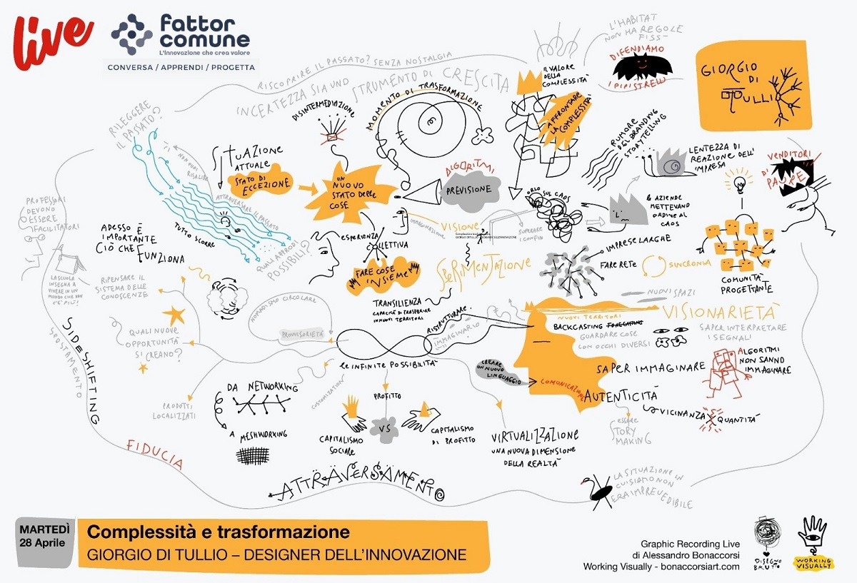 I primi ospiti sono stati Giorgio di Tullio su “Complessità e Trasformazione” (nell’immagine allegata il grafic recording realizzato in diretta da Alessandro Bonaccorsi durante il webinar di Giorgio Di Tullio) e Sabrina Toscani su “Organizzarsi al meglio ai tempi dello Smartworking. Questa settimana si confronteranno con i partecipanti Fabio Lisca (oggi, giovedì 30 aprile alle ore 17) che parlerà di “Business Agility”, e David Bevilacqua (sabato 2 maggio alle ore 11.30) che proseguirà il ciclo “Complessità e trasformazione”.