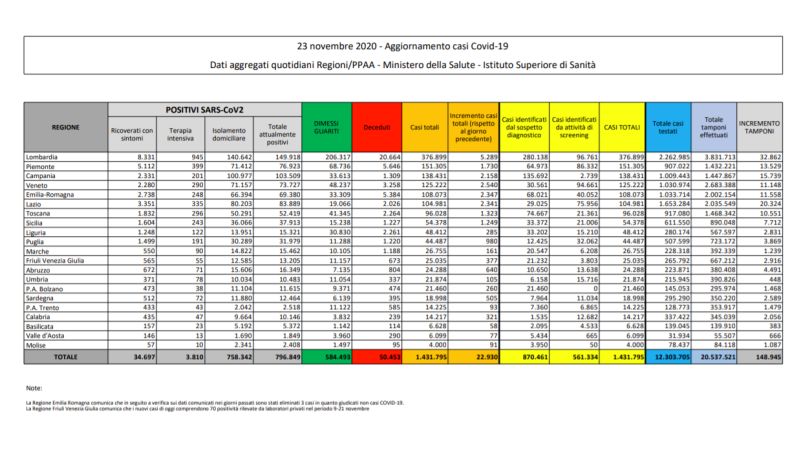 Attualmente i positivi in Italia sono 796.849, dei quali 758.342 in isolamento domiciliare. I ricoverati in ospedale con sintomi sono 34.697 (+418 rispetto a ieri), di questi 3.810 in terapia intensiva (+9). La regione con il maggior numero di nuovi casi è la Lombardia con 5.289, seguita da Veneto (2.540), Emilia-Romagna (2.347) e Lazio (2.341). Le Regioni con minore incremento di contagi sono Basilicata (58), Valle d’Aosta (77) e Molise (91).