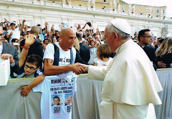 “Per il mio quarantesimo compleanno volevo regalarmi un’impresa non solo sportiva, ma per la vita e così ho pensato di correre da Papa Bergoglio, a Roma, e portargli il messaggio della Chiesa riminese e di Alberto Marvelli di cui si celebravano i dieci anni dalla beatificazione. Sono partito da Rimini e sono arrivato in Vaticano dopo tre giorni e mezzo che mi sono serviti per correre i 323 chilometri. Con me c’erano i miei amici Matteo Gabrielli e Andrea Martignoni che mi hanno scortato in bici mentre sul camper c’erano Roberta e Gaetano Petrizzo. Incontrare il Papa e consegnargli la maglia di Marvelli è stata un’emozione fortissima”.