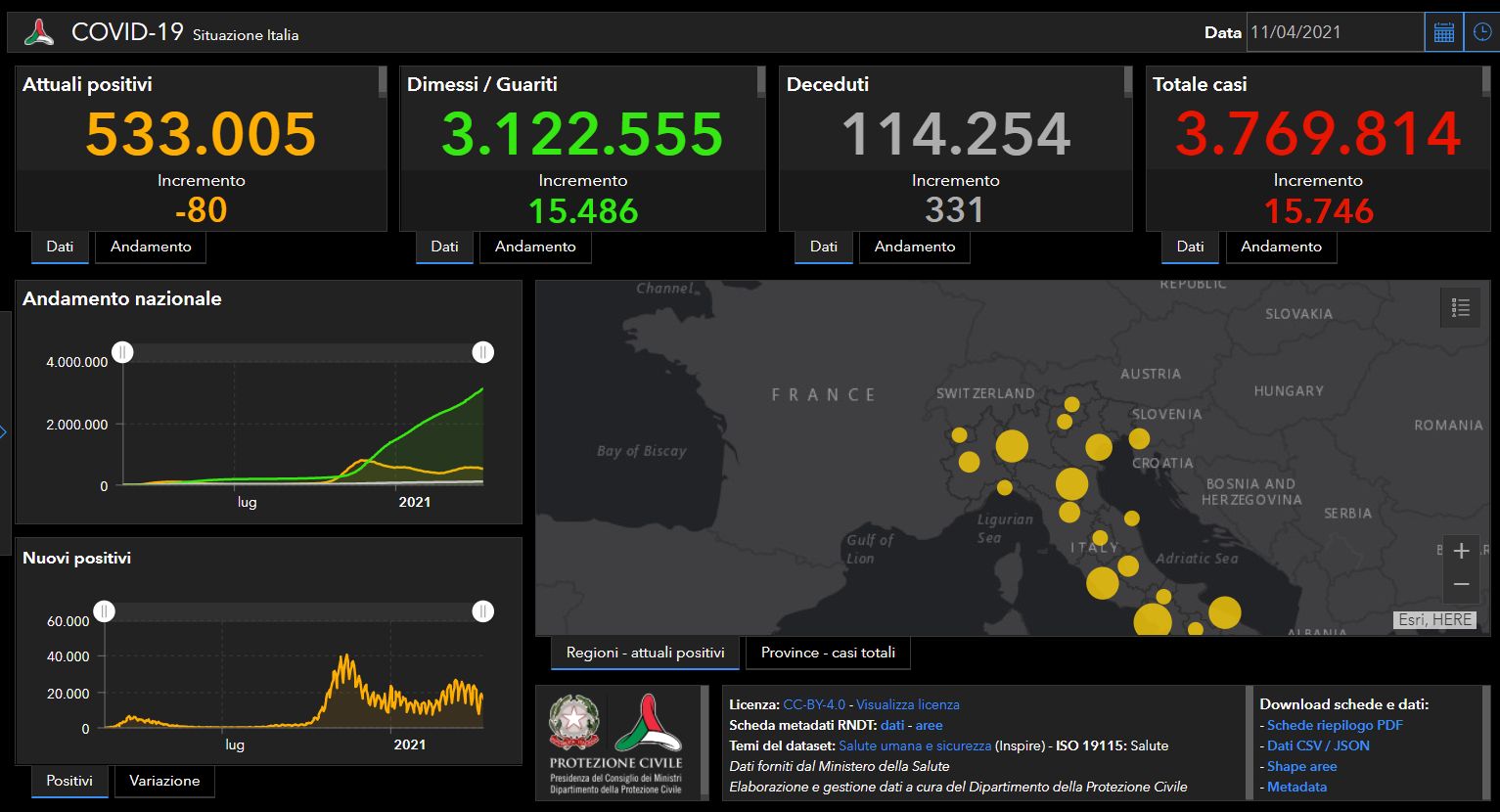 ROMA (ITALPRESS) – Sono 15.746 i nuovi casi di Coronavirus in Italia (ieri 17.567) a fronte di 253.100 tamponi effettuati su un totale di 53.054.866 da inizio emergenza. E’ quanto si legge nel bollettino del Ministero della Salute – Istituto Superiore di Sanità di oggi. Nelle ultime 24 ore sono stati 331 i decessi (ieri 344), che portano il totale di vittime da inizio pandemia a 114.254. Con quelli di oggi diventano 3.769.814 i casi totali di Covid in Italia. Attualmente i positivi sono 533.005 (-80), 502.169 le persone in isolamento domiciliare. I ricoverati in ospedale con sintomi sono 27.251 di cui 3.585 in Terapia intensiva. I dimessi/guariti sono 3.122.555 con un incremento di 15.486 unità nelle ultime 24 ore.