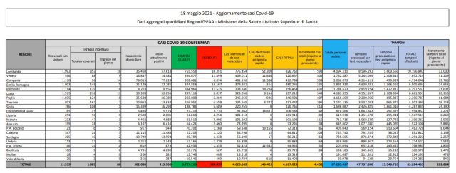 Si consolida intanto il trend di alleggerimento sugli ospedali. I ricoverati nei reparti ordinari scendono a 11.539, con un calo di 485 in 24 ore. Le terapie intensive calano a 1.689 (-65) con 86 nuovi ingressi. In isolamento domiciliare vi sono 302.080 persone. Le due regioni con il maggior numero di casi sono la Lombardia e la Campania che oggi registrano il medesimo numero di nuovi positivi (598), a seguire il Piemonte con 437. La regione con il dato più basso è il Molise con 3 nuovi contagiati.