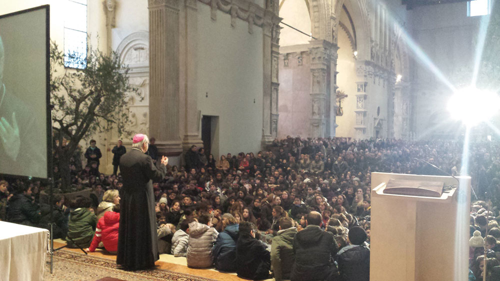 Al termine i ragazzi sono scesi in Cattedrale, accolti dall’applauso di ben 10 minuti dei genitori, mentre si sistemavano “ad aiuola” per terra davanti al presbiterio. Impressionante è il minuto di silenzio che il Vescovo invita a fare con genitori e ragazzi davanti all’immagine del Crocifisso di Giotto, rilanciata attraverso un gigantesco maxi-schermo.