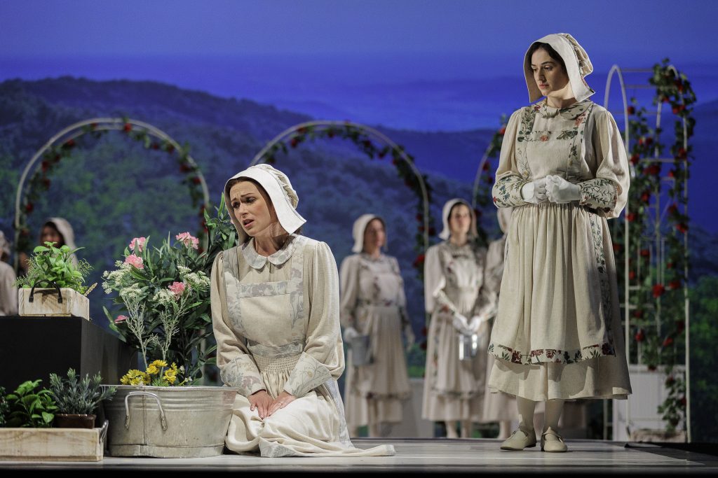 Data la breve durata, l’opera era in abbinamento con Suor Angelica: quasi a suggerire – attraverso una liaison des scènes rappresentata dal paesaggio sardo visibile sul fondale – come il carcere possa avere analogie con il convento in cui è rinchiusa la protagonista pucciniana. Anche in questo caso uno spettacolo ben diretto da Kern e con felici intuizioni nella regia di Loges: basterebbe citare la fuga finale di una monaca, evidentemente non dotata dello stesso rigore di Gramsci che non chiese mai la grazia per uscire dal carcere. Nell’ampio e ben amalgamato cast spiccava la protagonista, l’espressivo soprano Patricia Bänsch, fluida nell’emissione e intensa nel fraseggio; nei panni della zia principessa Michal Doron ha sfoggiato una pregevole timbratura contraltile; mentre come badessa e suora zelatrice sono ritornate i mezzosoprani Brault e Reich.