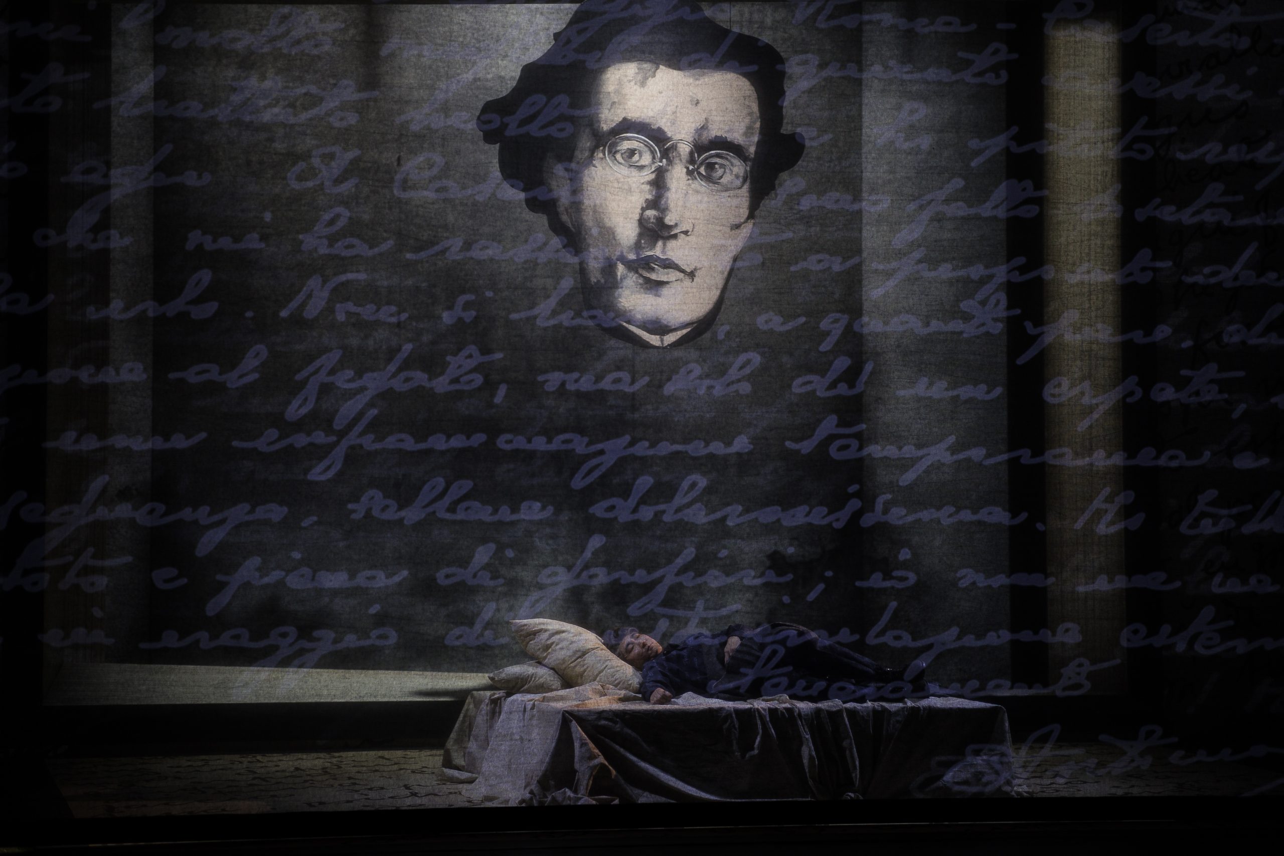Fondamentale, per la valorizzazione di Gramsci, l’ottima esecuzione della Neue Lausitzer Philharmonie diretta con slancio e, al contempo, millimetrica precisione da Ulrich Kern. Per quanto riguarda gli interpreti, il baritono Buyan Li – in palcoscenico quasi ininterrottamente – è stato un protagonista molto coinvolto sul piano emozionale. Accanto a lui Lisa Orthuber ha affrontato con sicurezza le colorature del ruolo di Tatjana, la cognata; l’espressivo mezzosoprano Johanna Brault è riuscita a incarnare con efficacia la fragilità della moglie, la violinista Julia; mentre un altro mezzosoprano, Yvonne Reich, si è immedesimata con accorata partecipazione nella dolente madre del protagonista. Agli interpreti maschili spettavano più personaggi: il tenore Yalun Zhang ha impresso limpidezza e sonorità sia al fratello Gennaro che a Togliatti, mentre il baritono Hans-Peter Struppe è apparso un po’ troppo stimbrato per dar voce a Mussolini e Stalin (e soprattutto allo spietato medico fascista che visita Gramsci in carcere).