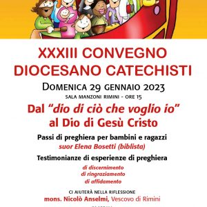 In programma domenica 29 gennaio 2023 in Sala Manzoni (via IV Novembre 37, Rimini. Per informazioni: Ufficio Catechistico Diocesano tel. 0541.1835105) dalle ore 15.00, il convegno sarà l’occasione per il Vescovo di Rimini mons. Nicolò Anselmi di incontrare – per la prima volta – tutti i catechisti e gli educatori della Diocesi e di rivolgere a loro la sua parola sul tema proposto.