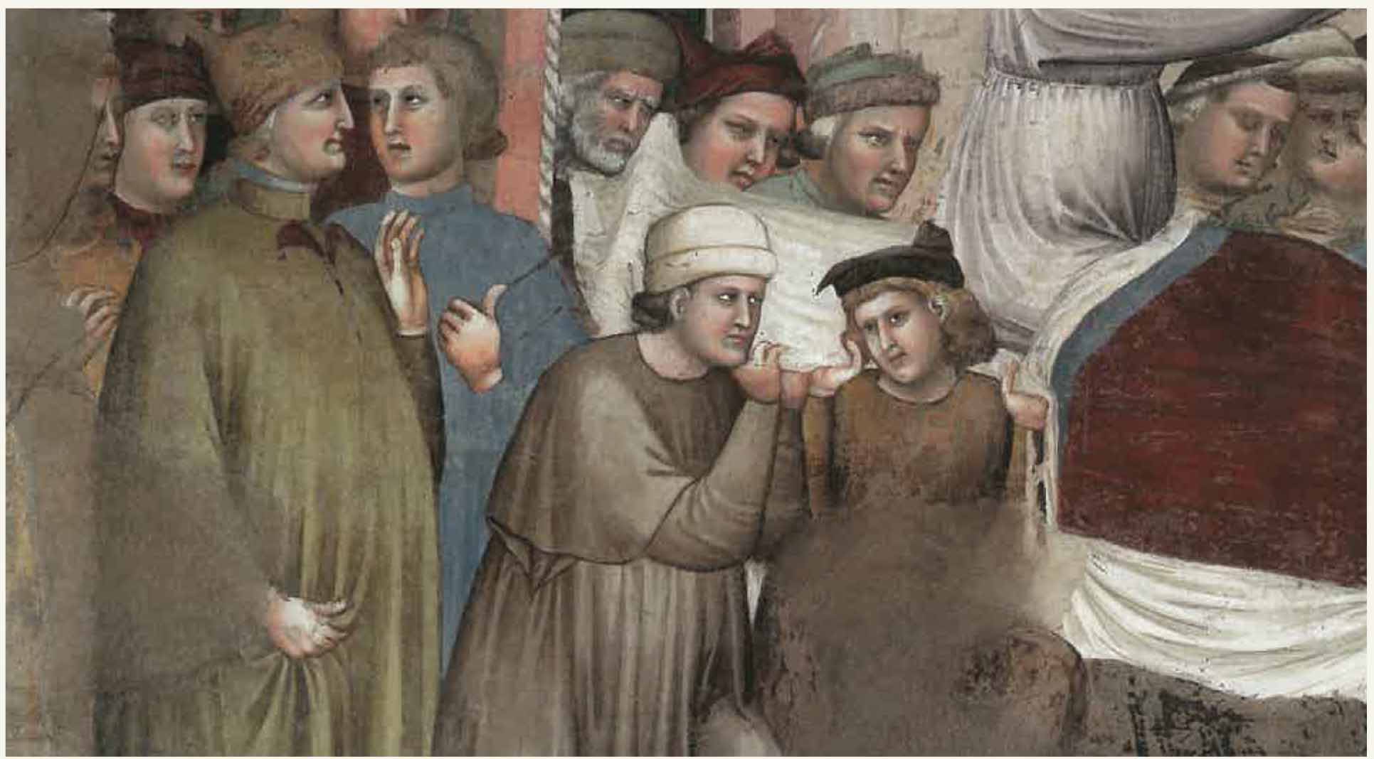 Taglia corto la questione il volume Il Trecento riminese in Sant’Agostino a Rimini di Angelo Turchini, Claudio Lugato e Alessandro Marchi (edizioni “Il Ponte Vecchio”, 1995): “Il poeta fiorentino veniva riconosciuto nel robusto personaggio dalla veste color verde oliva con risvolti vermigli, coperto di un elegante copricapo cinto di alloro; alla sua sinistra un altro personaggio gli indica la scena con gesto eloquente del pollice. Oggi questa identificazione non è più accettata; tuttavia questo personaggio è sicuramente importante dato che l’artista gli ha riservato un ruolo di prim’ordine”.