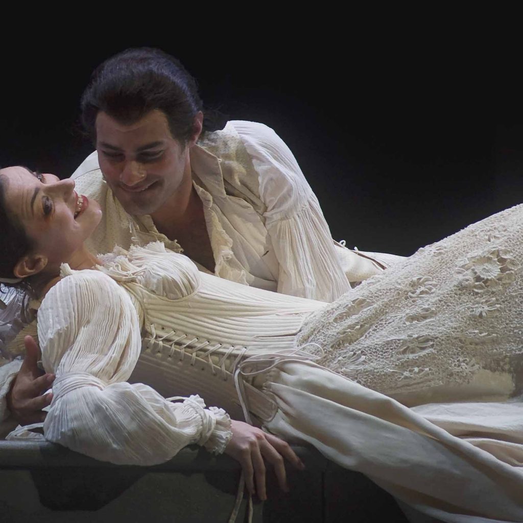 La elegante e raffinata cornice visiva, con un colonnato che si modula progressivamente, arricchendosi di statue e delineando una sorta di cripta (scene di Dante Ferretti e Francesca Lo Schiavo, mentre i bellissimi costumi sono di Maurizio Galante), confina Don Giovanni in una marmorea e un po’ raggelata classicità. Nel 1787 Mozart e Da Ponte avevano infatti elevato l’archetipo del “dissoluto punito” a figura mitologica, destando – nel tempo – l’interesse d’innumerevoli pensatori che l’hanno definitivamente consacrata nel novero dei classici. In questo spettacolo viene chiamato espressamente in causa il filosofo danese Søren Kierkegaard, autore di un celeberrimo saggio sul Don Giovanni: proiettati sul sipario, stralci dei suoi scritti ce lo ricordano, ma al tempo stesso spostano – fin troppo – l’accento su quel senso di morte che è connaturato soprattutto alla sensibilità romantica. Un aspetto ben leggibile nella personalità del protagonista: non certo, però, l’unica chiave di lettura.
