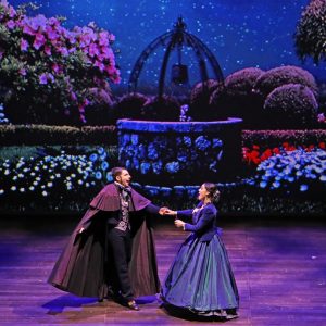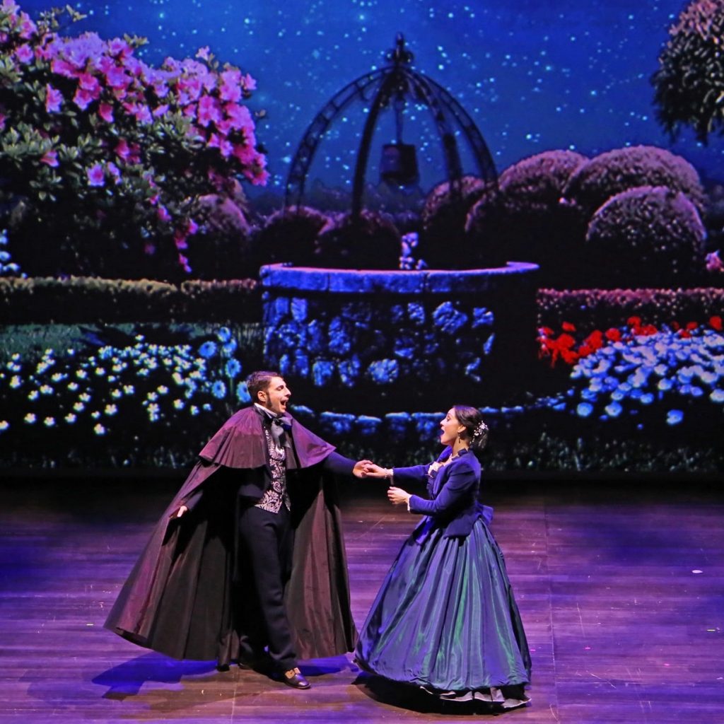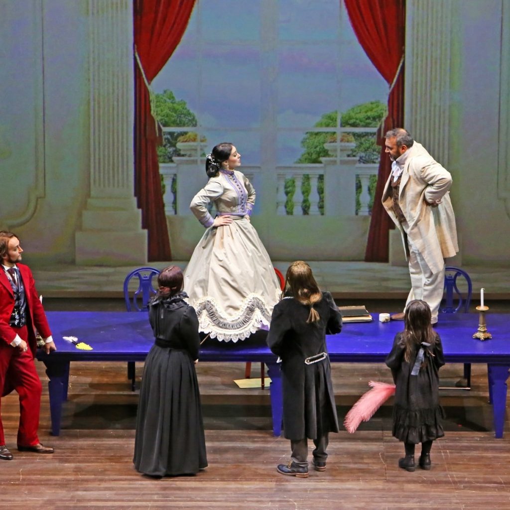 Il Coro Amintore Galli ha raccolto l’impegnativa sfida, scegliendo per la tradizionale produzione operistica di Capodanno proprio Don Pasquale, e ne ha affidato la cura registica a Paolo Panizza. Il suo allestimento fa ricorso – alla maniera della migliore scuola italiana – alle quinte dipinte, o almeno così si potrebbe pensare: in realtà la dimora del protagonista è disegnata attraverso proiezioni. Sfruttando le tante possibilità oggi offerte dalla tecnologia, il fondale si trasforma più volte nei diversi ambienti che fanno da cornice all’azione, compreso il giardino dell’incontro notturno tra Norina ed Ernesto. La modalità virtuale consente effetti sorprendenti e spiritosi come l’arrivo di un grande piccione, o il passaggio di un cavallo (il disegno proiezioni porta la firma di Enrico Pazzagli e Roberto Ajovalasit), ma nello stesso tempo Panizza non rinuncia al suo ruolo di regista attraverso interventi – a cominciare dalla famigliola di servi nerovestiti – che potenziano il libretto senza stravolgerlo.