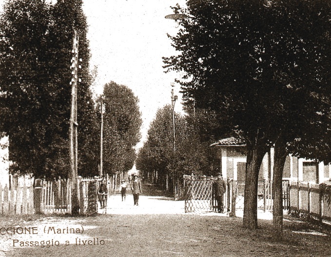 Le due zone, collegate dalla ‘Viola’, furono divise dalla ferrovia nel 1861 e da allora il treno passò fra la terra dei campi e la sabbia del mare e fin da allora, per molto tempo, segnò una linea di demarcazione fra due mondi diversi. Il passaggio a livello di Riccione ebbe il numero 120, messo bene in vista dal casello che ne segnalava la presenza. Però il treno non si fermava: la locomotiva a vapore, trascinando i suoi vagoni passava sferragliando, salutava con uno sbuffo nero di fumo ed uno bianco di vapore, passava
