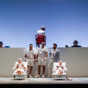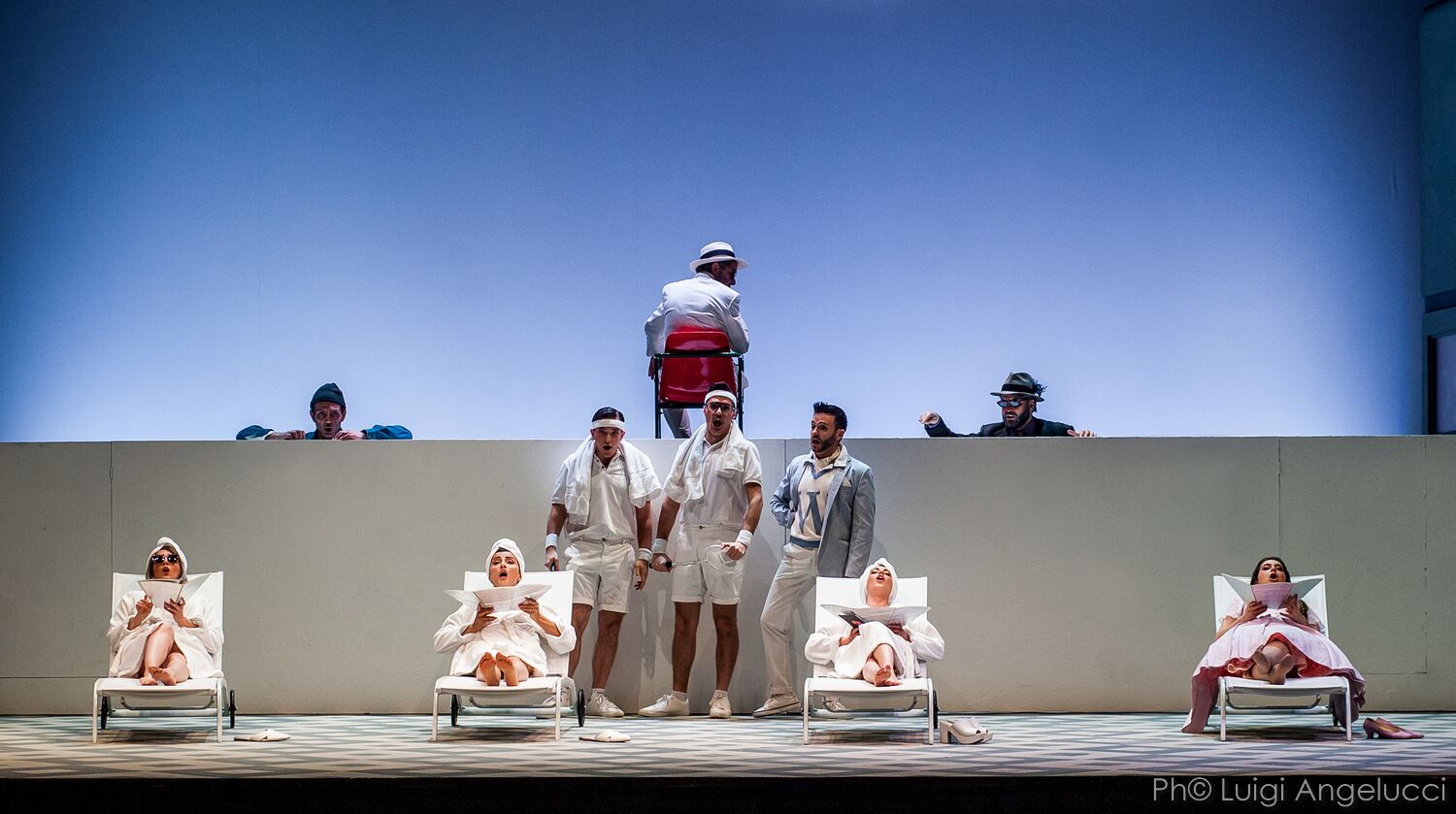 Falstaff però si gioca soprattutto sul versante musicale. In una lettura tesa a privilegiare la pulizia del suono e a valorizzare la raffinatezza dell’orchestrazione verdiana, il direttore Francesco Cilluffo ha ottenuto corrette sonorità dall’Orchestra Sinfonica Rossini di Pesaro, senza mai coprire i cantanti e prestando attenzione all’appiombo ritmico, più che mai necessario in un’opera dove abbondano le insidie contrappuntistiche.