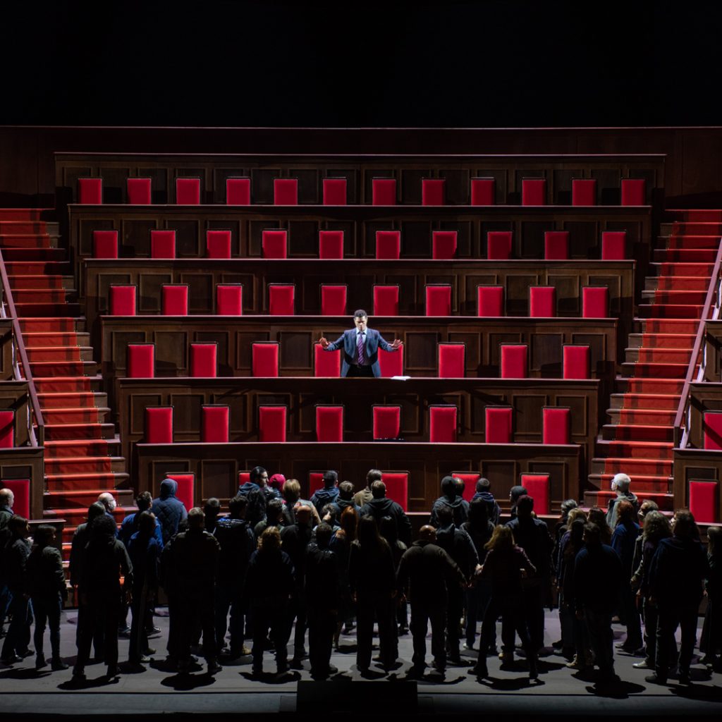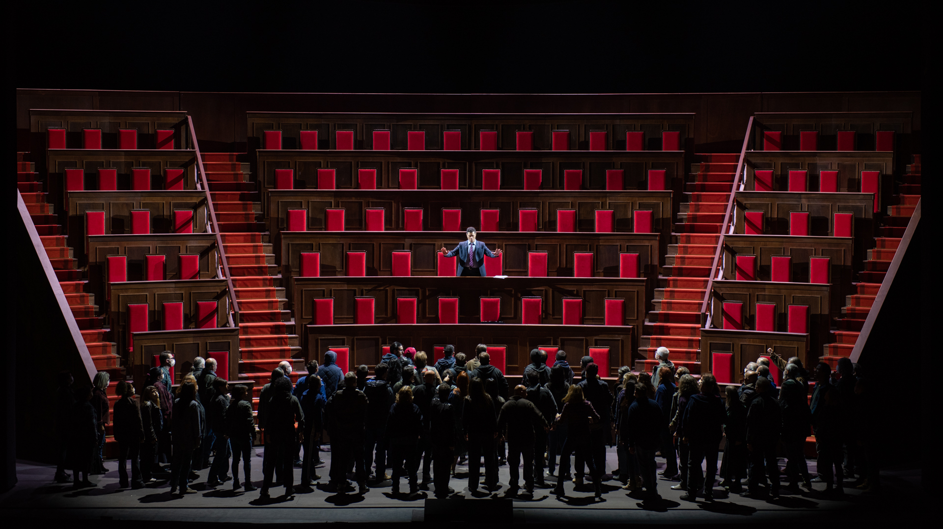 Sul fronte scenico, il regista Robert Carsen ha costruito con la stessa consapevolezza uno spettacolo ambientato nel nostro tempo, che potrebbe valere per qualunque latitudine e, soprattutto, essere facilmente esportato. Mancano infatti legami espliciti con Roma e l’Italia, se si eccettua il tricolore che avvolge il cadavere di Cesare quando viene mostrato al popolo: i senatori sono vestiti come moderni agenti di borsa (i costumi sono di Luis F. Carvalho), con le loro cartelle portadocumenti, né la scenografia algida e asettica di Radu Boruzescu, che ricostruisce l’aula ad anfiteatro del Senato, possiede una precisa connotazione geografica (e meno che mai italiana, almeno per l’idea che ci siamo fatti di Palazzo Madama attraverso le cronache parlamentari).