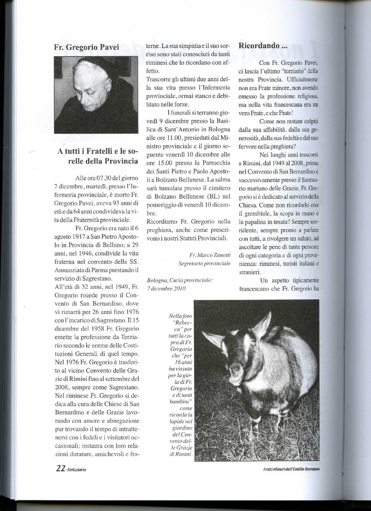 “ All’età di 32 anni, nel 1949 Fr. Gregorio risiede presso il convento di San Bernardino, dove vi rimarrà per 26 anni fino al 1976 con l’incarico di Sacrestano… Nel 1976 Fr. Gregorio è trasferito al vicino Convento delle Grazie di Rimini fino al settembre del2008, sempre come sacrestano… Un aspetto tipicamente francescano che Fr. Gregorio ha vissuto, a volte in forme un po’ eccessive, è il suo amore per gli animali: i cani, i gatti, ma soprattutto l’amata Rebecca, la capretta che per tanti anni è stata la sua fedele accompagnatrice in tutti i luoghi del convento e della Chiesa…”
