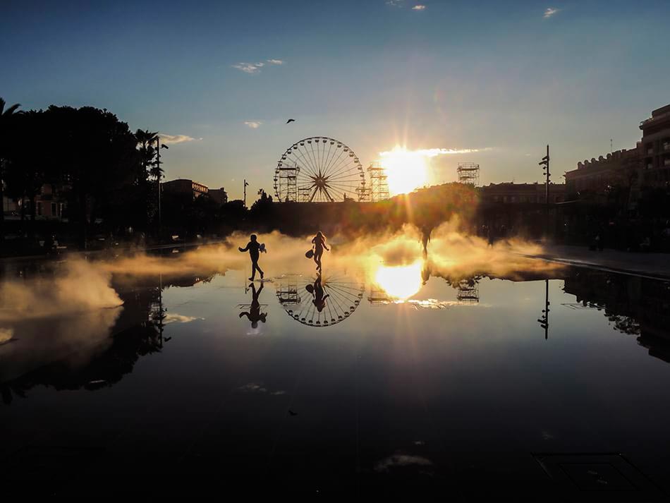 “Semplicemente che mentre leggevo la rivista mi sono imbattuto in un concorso fotografico intitolato «Luoghi e Paesaggi» e immediatamente mi è venuta in mente una foto che avevo scattato a Nizza nel famoso viaggio non programmato. Di quel pomeriggio ricordo tutto. Stavo passando in questa piazza dove all’orizzonte il sole stava iniziando a tramontare. Sullo sfondo c’era una grande ruota panoramica come quella che abbiamo sul molo. In primo piano, invece, c’erano dei bambini che stavano giocando in mezzo a zampilli d’acqua. All’improvviso i getti si sono fermati e il caldo che c’era in quel momento ha fatto evaporare l’acqua. Quella che, invece, ricopriva le mattonelle ha fatto da specchio al cielo. Ho avuto la fortuna di fare questo scatto, diciamo che mi sono trovato nel luogo giusto al momento giusto. Comunque, tornando a noi, quando sono rientrato a casa sono andato a riprendere la foto e l’ho spedita. Ma l’ho fatto per gioco, mai e poi mai pensavo che potessi vincere il primo premio. Anche perché il concorso era aperto ai professionisti”.