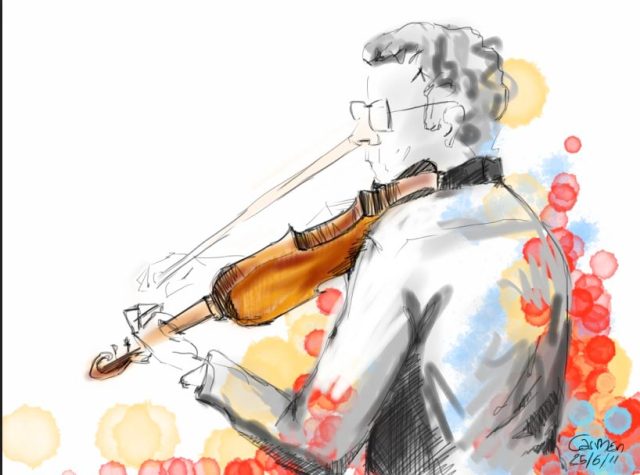 Qualche tempo fa. Il signore con i baffi, appoggiato alla porta della toilette, non se ne accorge nemmeno. Lithium dei Nirvana deborda dalle sue cuffiette mentre due studenti, stretti vicino alla porta dello scompartimento, provano a studiare per non so quale esame. Lui – capelli biondi lunghi raccolti in una coda di cavallo, la barba rossiccia – tira fuori uno spartito. Chiude gli occhi e, mentre le mani disegnano arbareschi nell’aria, segue l’armonia con un canto flebile. Nella confusione, il rumore del treno sulle rotaie, nessuno sembra notarlo.