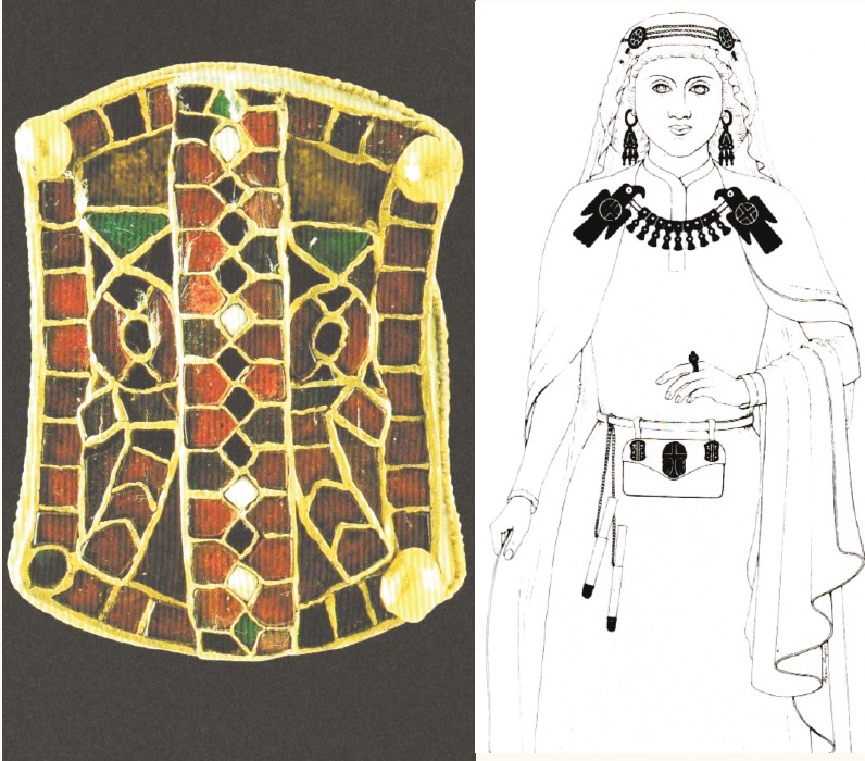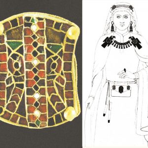Uno studioso inglese, Dafydd Kidd, ha ricostruito il presumibile abbigliamento della donna cui appartenevano i gioielli trovati a Domagnano: la borchia superstite del Museo di San Marino forse era uno degli ornamenti della borsetta che portava alla cintura. Tale abbigliamento è stato confrontato con quello delle donne dell’aristocrazia bizantina, riscontrando delle analogie, ma direi che sono maggiori le differenze, soprattutto nel gusto per l’ostentazione dei gioielli d’oro. La signora di Domagnano si mostra davvero come una “barbara arricchita”, e il suo ricco abbigliamento è sostanzialmente privo dell’eleganza di quello delle donne raffigurate in tante opere d’arte prodotte contemporaneamente nei territori propriamente bizantini.