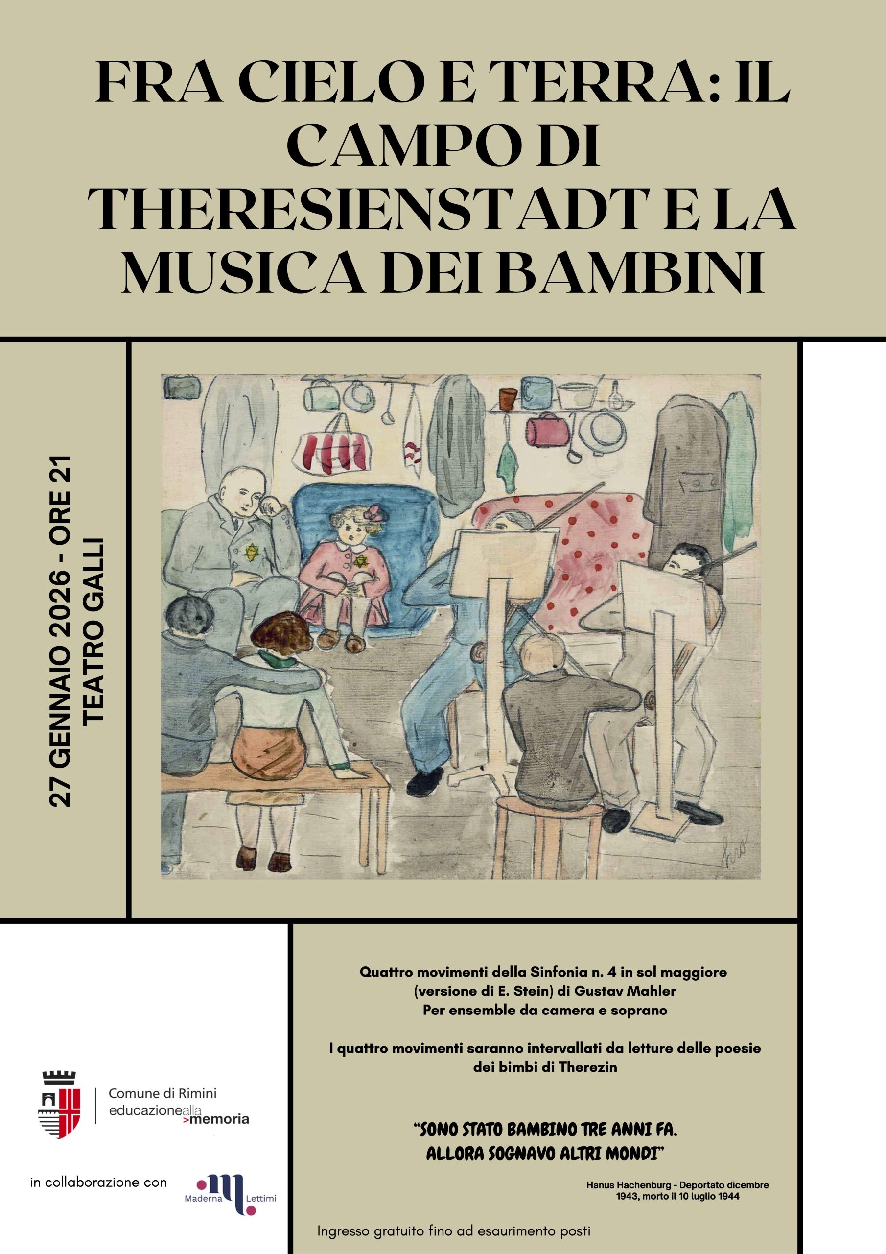 Sempre musica, ma questa volta per tutti, il 27 gennaio, ore 21, al Teatro Galli. “Fra cielo e terra: il campo di Theresienstadt e la musica dei bambini” è il titolo dello spettacolo a cura degli studenti del conservatorio Maderna-Lettimi. Eseguiranno i 4 movimenti della Sinfonia n.4 di Gustav Mahler (versione da camera di E. Stein), intervallata da letture delle poesie dei bambini di Terezín: un omaggio alla resistenza culturale e umana, anche dentro l’orrore del ghetto-campo.