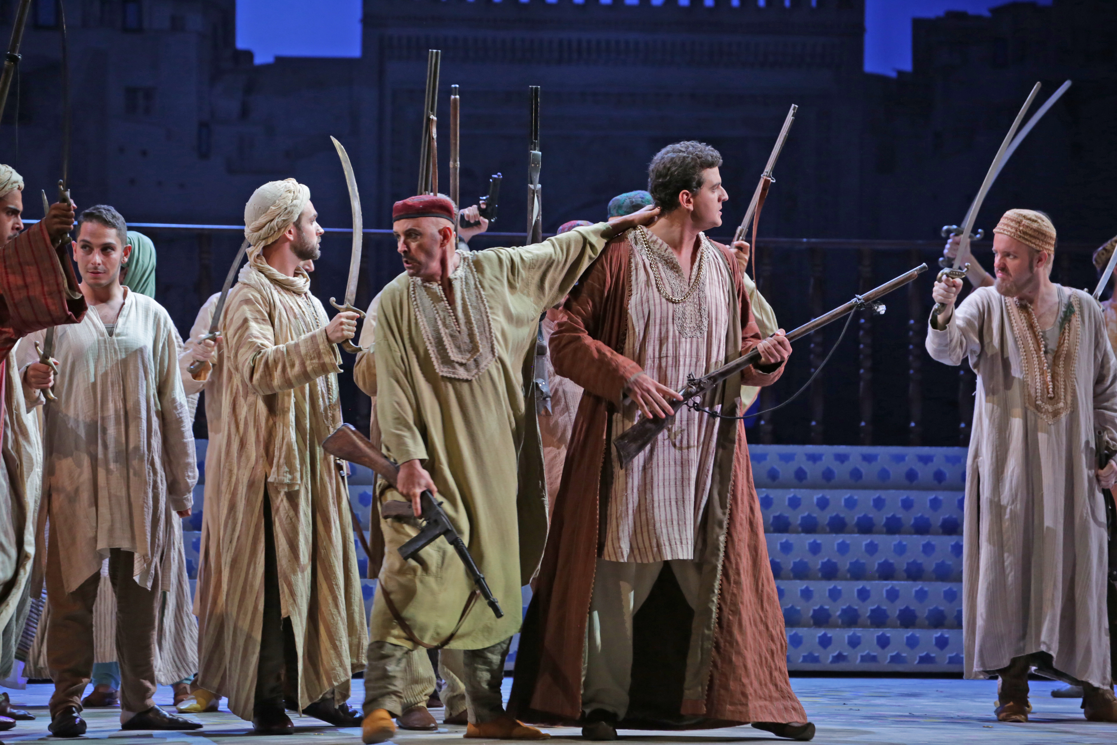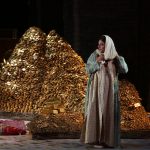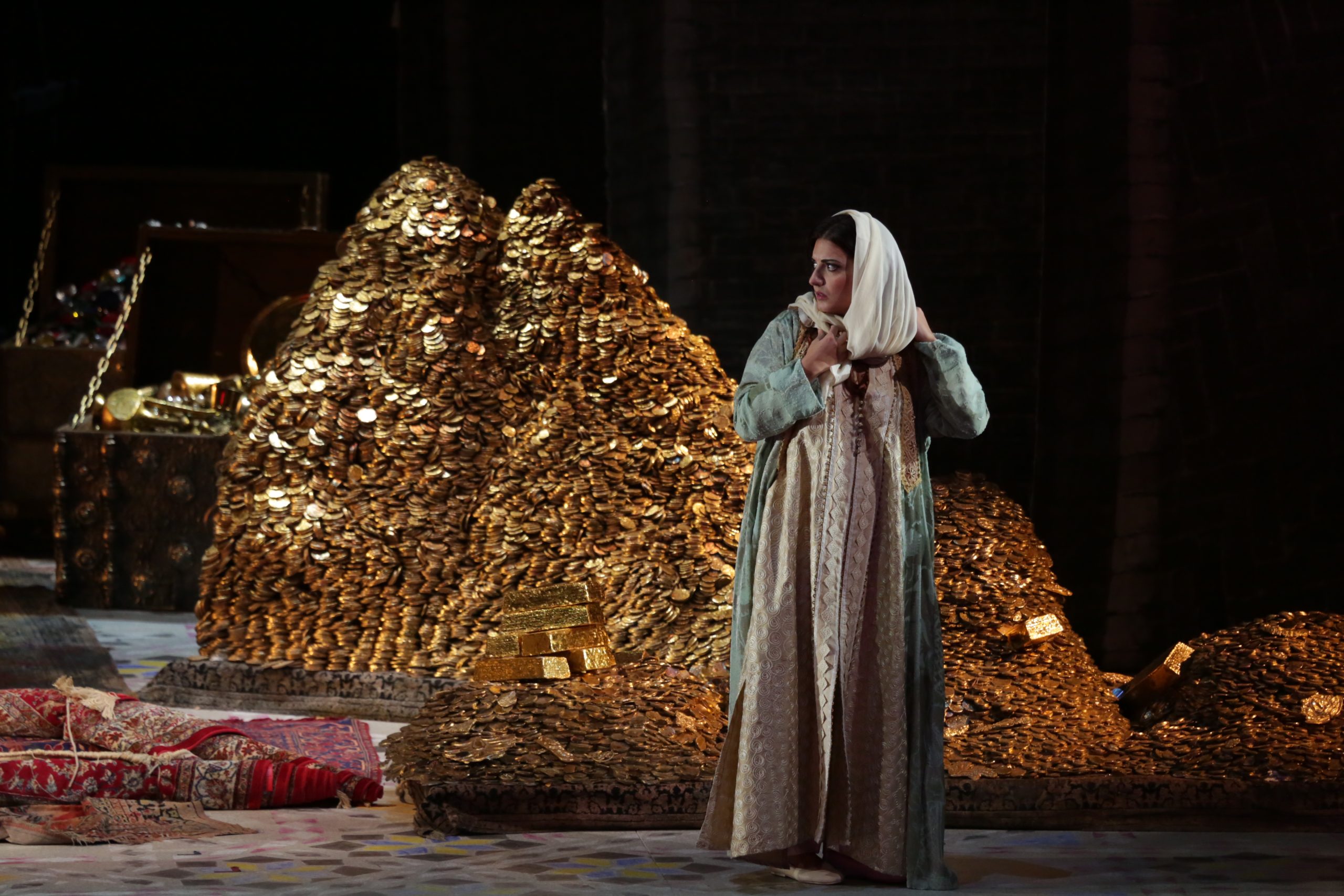 Lo spettacolo della Cavani ha il pregio di mescolare con intelligenza il piano della narrazione favolistica e della modernità, ben leggibili nel libretto originale ma che la traduzione italiana di Vito Frazzi, con le sue sforbiciature e un linguaggio datato e poco brillante, purtroppo non riesce a trasmettere. Eppure, al di là dell’amore disinteressato fra l’ingenuo Nadir e la tenera Delia, il vero nucleo drammatico di questa favola è di grande attualità, nell’ottocento e ancor più adesso: tutto ruota attorno al denaro, all’avidità e alla corruzione che inevitabilmente la ricchezza veicola. Un aspetto ben valorizzato dall’allestimento: sia dalle scene di Leila Fteita, che mostrano le montagne di oro accumulate dai quaranta ladroni nella loro caverna, sia dagli sfarzosi costumi di Irene Monti.