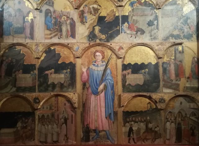 Oltre alla traccia agiografica, la Chiesa di San Giuliano, luogo in cui si svolge l’evento, viene presentata attraverso le vicende storiche e le testimonianze artistiche che la caratterizzano; fra l’altro: le tracce benedettine, il rifacimento cinquecentesco e la posizione strategica lungo la Via Emilia; il polittico di Bittino da Faenza con la storia di San Giuliano (in foto), vera e proprio esempio di “biblia pauperum” e la pala d’altare ad opera del Veronese.
