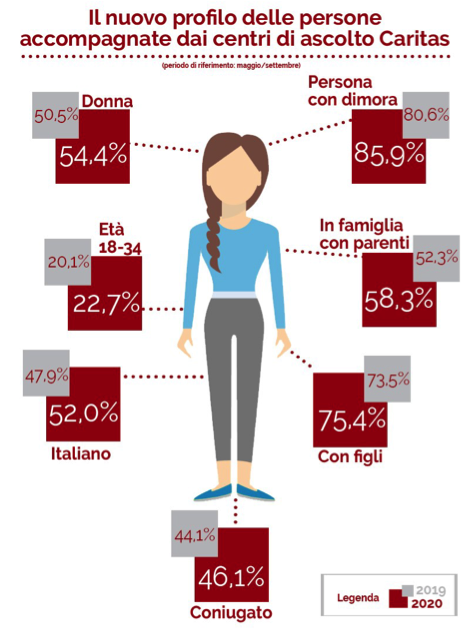 I dati raccolti da Caritas Italiana mostrano un incremento del 12,7% del numero di persone seguite nel 2020 rispetto allo scorso anno. I Centri di Ascolto testimoniano un incremento della povertà rispetto ai tempi pre-Covid. Un incremento che è sicuramente sottostimato se si pensa alle difficoltà sperimentate in questo tempo nella registrazione e/o aggiornamento delle schede.